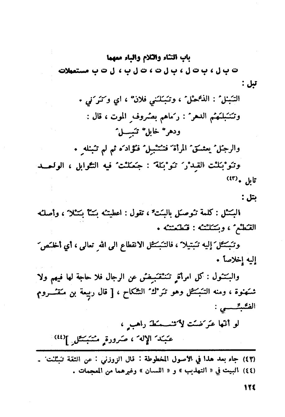 باب التاء واللام والباء معهما ت ب ل، ب ت ل، ب ل ت، ت ل ب، ل ت ب مستعملات