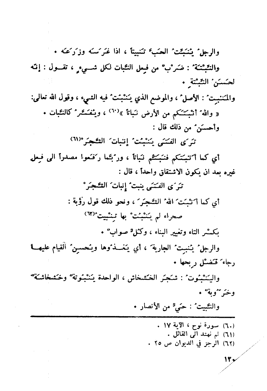 والرجلُ يُنَبِّتُ الحَبَّ تَنبيتاً، إذا غَرَسَه وزَرَعَه. والنِّبْتَةُ: ضَرْبٌ من فِعل النَّبات لكل شيءٍ، تقول: إنّه لحَسَن النِّبْتةِ. والمَنبِتُ: الأصلُ، والموضع الذي يَنْبُتُ فيه الشيء، وقول الله تعالى: وَاللَّهُ أَنْبَتَكُمْ مِنَ الْأَرْضِ نَباتاً «60» ، ويُفَسَّرُ كالنَّبات. وأحسَنُ من ذلك قال: