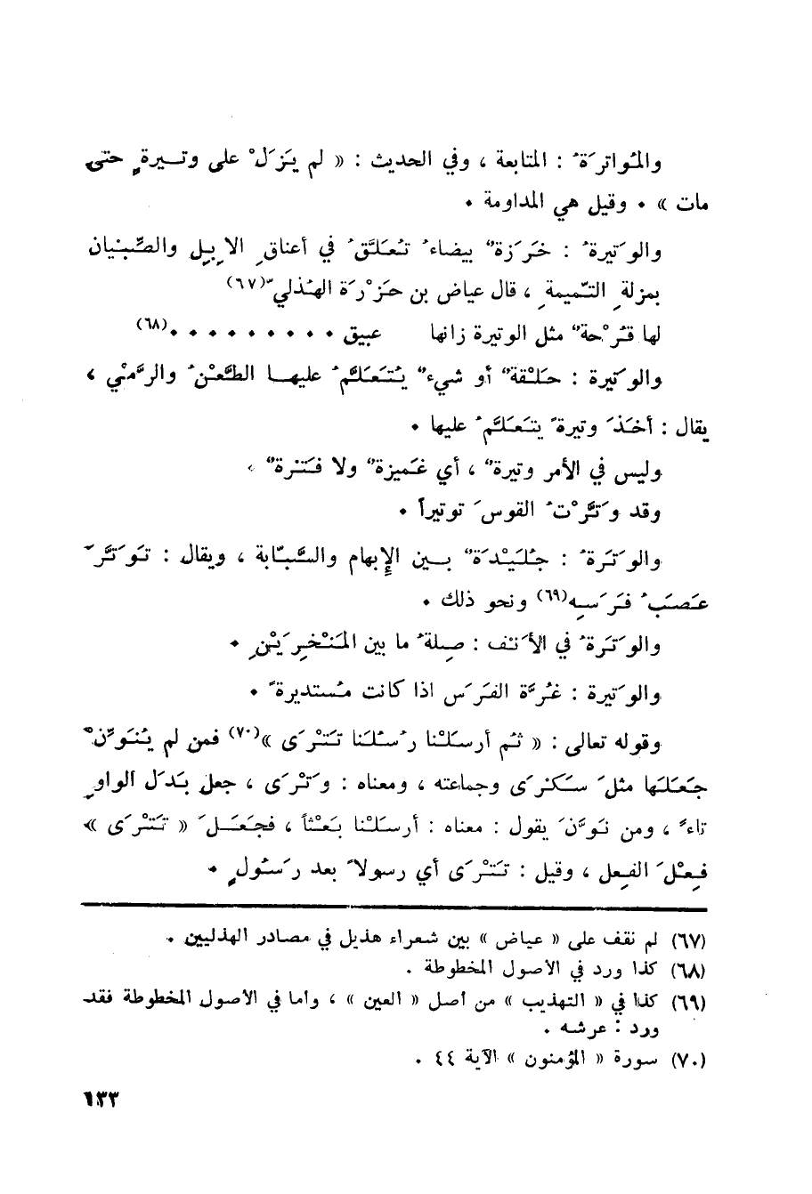 والوَتيرة: حَلْقةٌ أو شيء يُتَعَلَّم عليها الطَّعْنُ والرَّمْي، يقال: أخَذَ وتيرةً يتَعَلَّم عليها. وليس في الأمر وتيرةٌ، أي غَميزةٌ ولا فَترةٌ. وقد وَتَّرْتُ القوسَ توتيراً. والوَتَرةُ: جُلَيْدَةٌ بين الإِبهام والسَّبّابة، ويقال: تَوَتَّرَ عَصَبُ فَرَسِه «69» ونحو ذلك. والوَتَرةُ في الأَنف: صِلةُ ما بين المَنْخِرَيْنِ. والوَتيرة: غُرَّة الفَرَس إذا كانت مُستديرةً. وقوله تعالى: ثُمَّ أَرْسَلْنا رُسُلَنا تَتْرا