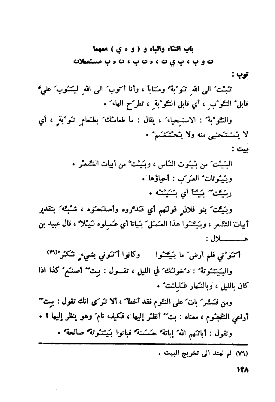 بيت: البَيْتُ من بُيُوت النّاس، وبَيْتٌ من أبيات الشِّعْر. وبُيُوتاتُ العَرَب: أحياؤها. وبَيَّتُّ بَيْتاً أي بَنَيْتُه. وبَيَّتَ بنو فلان قولهم أي قَدَّروه وأصلَحُوه، شُبِّهَ بتقدير أبيات الشعر، وبيتوا هذا العَمَلَ بَياتاً أي عملوه ليلا، قال عبيد بن هلال: