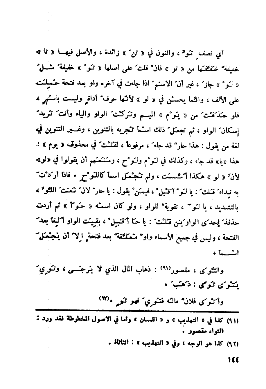أي نصفِ تَوٍّ، والنون في تنّ زائدة، والأصل فيها تا خفيفةٌ خَفَّفَها من تو فإنْ قلتَ على أصلها تَوْ خفيفةً مثلُ لَوْ جازَ، غير أنّ الأسمَ إذا جاءت في آخره وأو بعد فتحة حُمِلَت على الألف، وإنَّما يحسُن في لو لأنّها حرفُ أداةٍ وليست باسَمٍ، فلو حَذَفْتَ من يَوْم الميم وتَركْتَ الواو والياء وأنتَ تُريدُ إِسكانَ الواو، ثم تجعَلُ ذلك اسْماً تُجرية بالتنوين، وغير التنوين في لغة من يقول: هذا حارٌ قد جاءَ، مرفوعاً، لقُلْتَ في محذوف يوم: هذا يا قد جاء، وكذلك في لَوْم ولَوْح، ومَنَعَهم أن يقولوا في لو لأنَّ لو هكذا أُسِّسَت، ولم تُجْعَل اسماً كاللّوْحِ. فإذا أرَدْتَ به نِداءُ قُلتَ: يا لَوُّ أَقْبلَ، فيمَنْ يقول: يا حارُ لأنّ نَعتَ اللَّوِّ، بالتشديد، يا لَوُ، تقويةٌ للواو، ولو كان اسمُه حَوّاً ثم أردت حذفذَ إحدَى الواوَين قُلْتَ: يا حَا أَقبِلْ، بقِيَت الواو أَلِفاً بعدَ الفتحة، وليس في جميع الأسماء واوٌ مُعَلَّقةٌ بعد فتحةٍ إِلاّ أن يُجْعَلَ اسْماً. والتَّوَى، مقصور «91» : ذهاب المال الذي لا يُرجَى، وتَوِيَ يَتْوَى تَوىً: ذَهَبَ. وأَتْوَى فلانٌ مالَه فتَوِيَ فهو تو «92» .