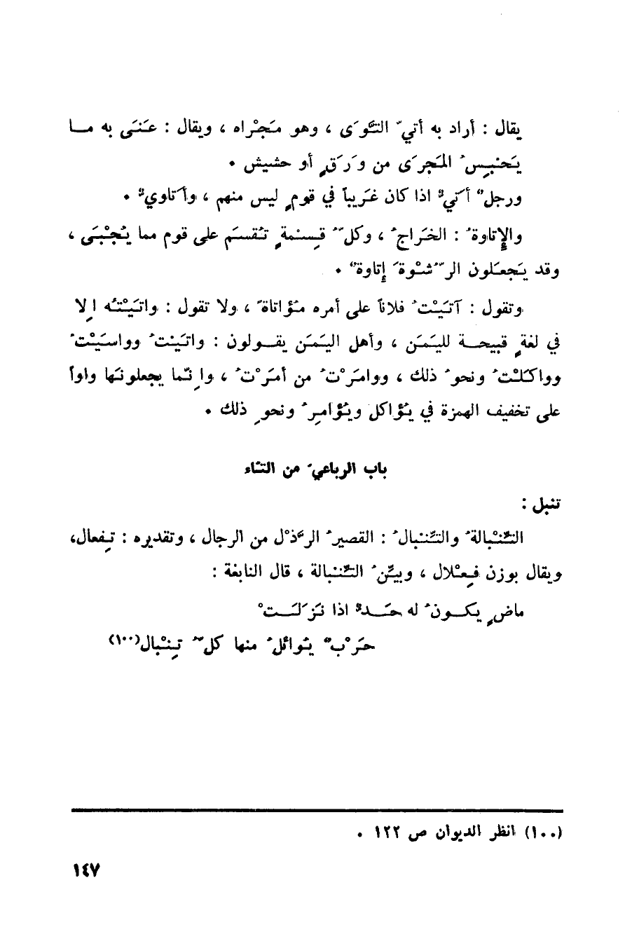 يقال: أراد به أتيّ التَّوَى، وهو مَجْراه، ويقال: عَنَى به ما يَحبِسُ المَجرَى من وَرَقٍ أو حشيش. ورجلٌ أَتيٌّ إذا كان غَريباً في قومٍ ليس منهم، وأَتاويٌّ. والإِتاوةُ: الخَراجُ، وكلُّ قِسمةٍ تُقسَم على قوم مما يُجْبَى، وقد يَجعَلون الرُّشْوةَ إِتاوةٌ. وتقول: آتَيْتُ فلاناً على أمره مُؤاتاةً، ولا تقول: واتَيْتُه إِلاّ في لغةٍ قبيحة لليَمَن، وأهل اليَمَن يقولون: واتَيتُ وواسَيْتُ وواكَلْتُ ونحوُ ذلك، ووامَرْتُ من أمَرْتُ، وإنِّما يجعلونَها واواً على تخفيف الهمزة في يُؤاكل ويُؤامِرُ ونحوِ ذلك.