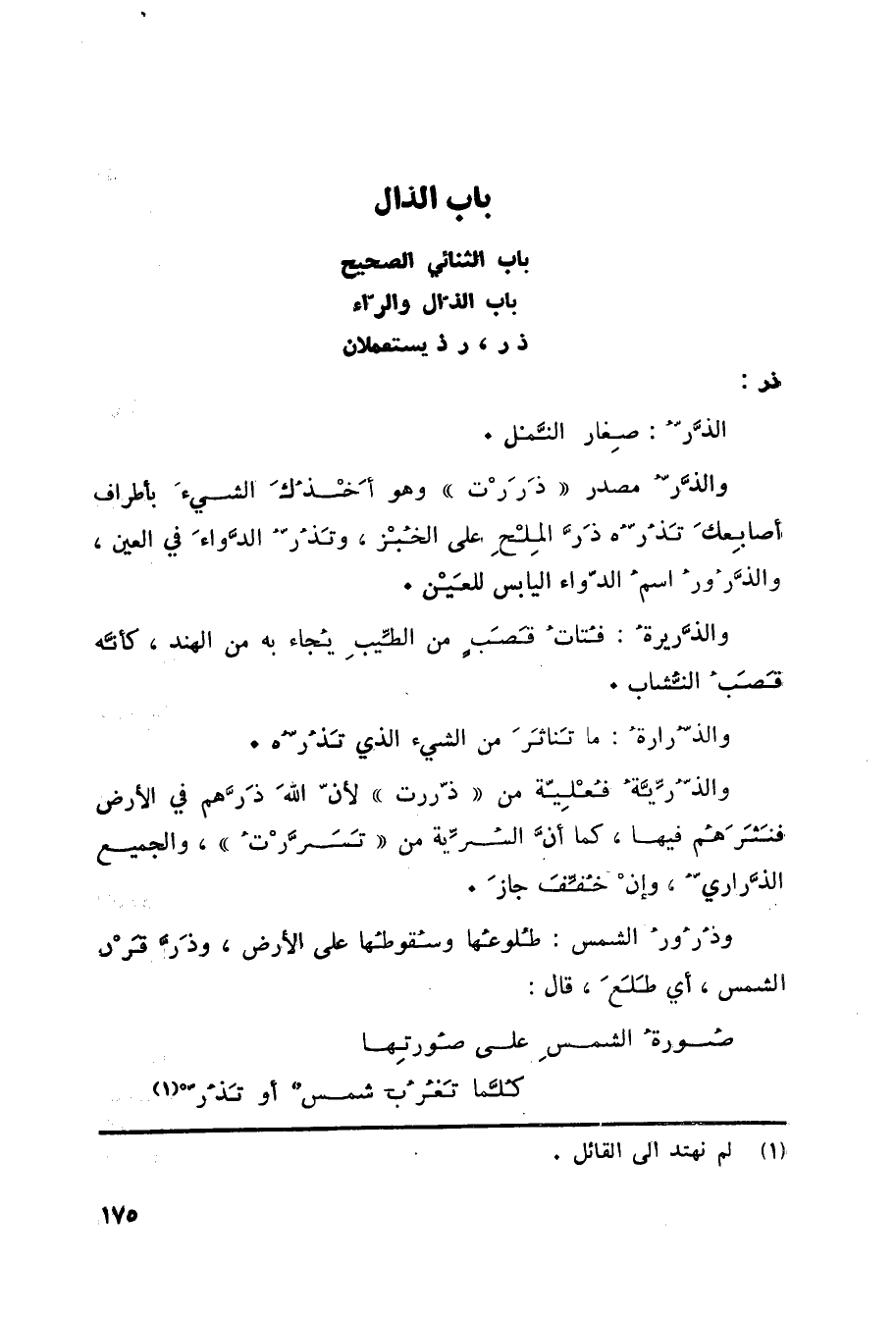 ذر: الذَّرُّ: صِغارُ النَّمل. والذَّرُّ مصدر ذَرَرْت وهو أَخْذُكَ الشيءَ بأطراف أصابِعكَ تَذُرُّه ذَرَّ المِلْحِ على الخُبْز، وتَذُرُّ الدَّواءَ في العين، والذَّرُورُ اسمُ الدّواء اليابس للعَيْن. والذَّريرةُ: فُتاتُ قَصَبٍ من الطِّيبِ يُجاء به من الهند، كأنَّه قَصَبُ النُّشاب. والذُّرارةُ: ما تناثر من الشيء الذي تَذُرُّه. والذُّرِّيَّةُ فُعْلِيّة من ذّررت لأنّ اللَّهَ ذَرَّهم في الأرض فنَثَرَهُم فيها، كما أنَّ السُرِّية من تَسَرَّرْتُ، والجميع الذَّراريُّ، وإنْ خُفِّفَ جازَ. وذُرُورُ الشمس: طُلوعُها وسُقوطُها على الأرض، وذَرَّ قَرْن الشمس، أي طَلَعَ، قال: