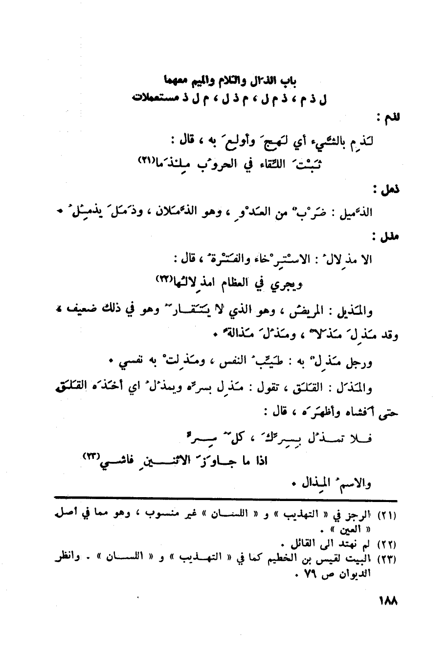 باب الذّال والّلام والميم معهما ل ذ م، ذ م ل، م ذ ل، م ل ذ مستعملات