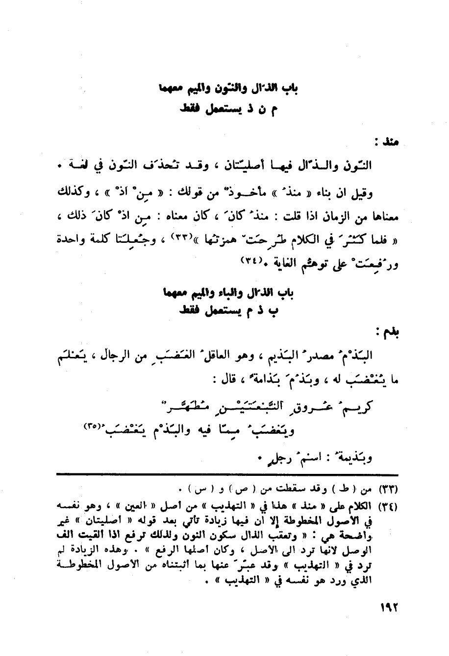 (34) الكلام على منذ هذا في التهذيب من أصل العين، وهو نفسه في الأصول المخطوطة إلا أن فيها زيادة تأتي بعد قوله أصليتان غير واضحة هي: وتعقب الذال سكون النون ولذلك ترفع إذا ألقيت ألف الوصل لأنها ترد إلى الأصل، وكان أصلها الرفع. وهذه الزيادة لم ترد في التهذيب وقد عبر عنها بما أثبتناه من الأصول المخطوطة الذي ورد هو نفسه في التهذيب.