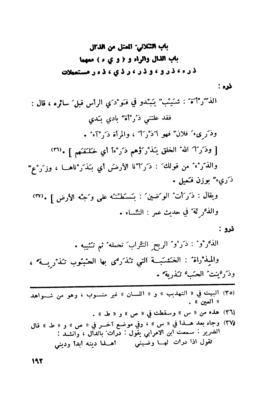 باب الذال والراء و (ويء) معهما ذ رء، ذ ر و، وذ ر، ر ذ ي، ذء ر مستعملات