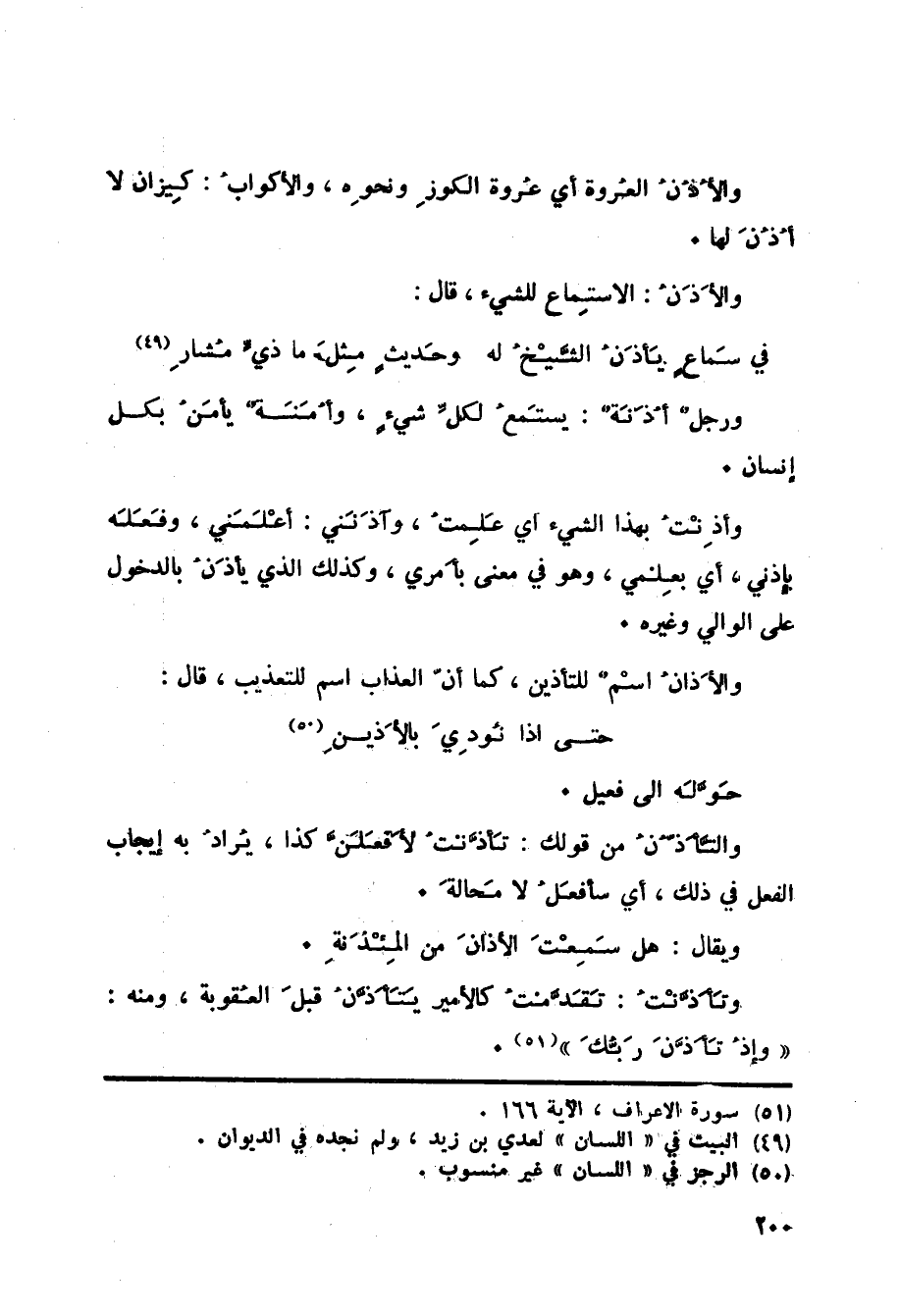 ورجلٌ أُذَنَةٌ: يستَمعُ لكلِّ شيءٍ، وأُمَنَةٌ يأمَنُ بكل إنسان. وأذِنْتُ بهذا الشيء أي عَلِمتُ، وآذَنَني: أعلمني، وفعله بإذني، أي بعِلْمي، وهو في معنى بأَمري، وكذلك الذي يأذَنُ بالدخول على الوالي وغيره. والأَذانُ اسْمٌ للتأذين، كما أنّ العذاب اسم للتعذيب، قال: