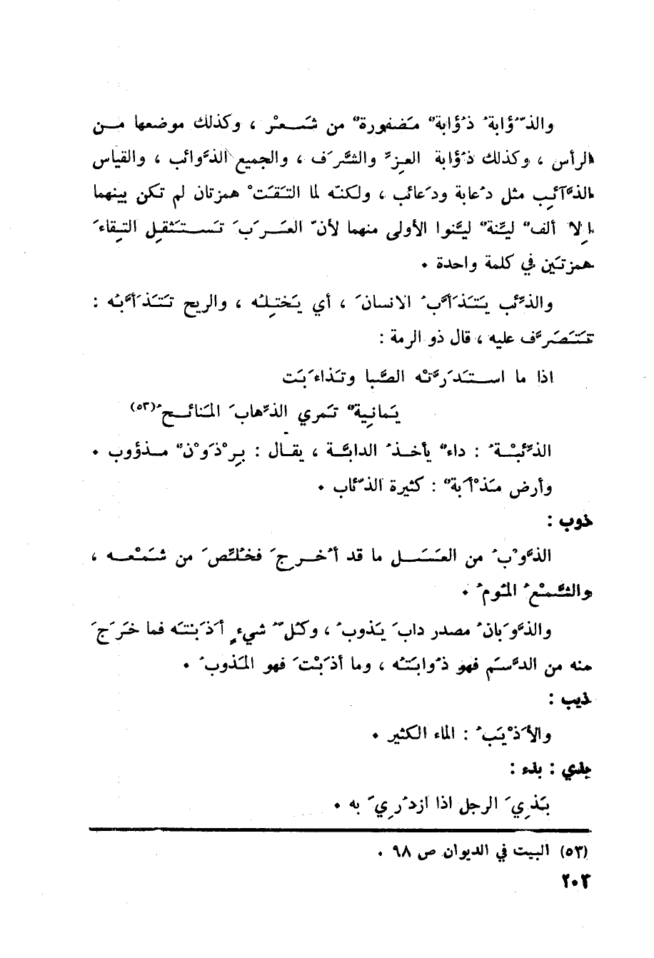 والذُّؤابةُ ذُؤابةٌ مَضفورةٌ من شَعْر، وكذلك موضعها من الرأس، وكذلك ذُؤابةٌ العِزِّ والشَّرَف، والجميع الذَّوائب، والقياس الذَّآئِب مثل دُعابة ودَعائب، ولكنّه لما التَقَتْ همزتان لم تكن بينهما اِلاّ ألفٌ ليِّنةٌ ليَّنوا الأولى منهما لأنّ العَرَبَ تَستَثقِل التِقاءَ همزتَين في كلمة واحدة. والذِّئب يَتَذَأَّبُ الإنسانَ، أي يَختِلُه، والريح تَتَذَأَّبُه: تَتَصَرَّف عليه، قال ذو الرمة: