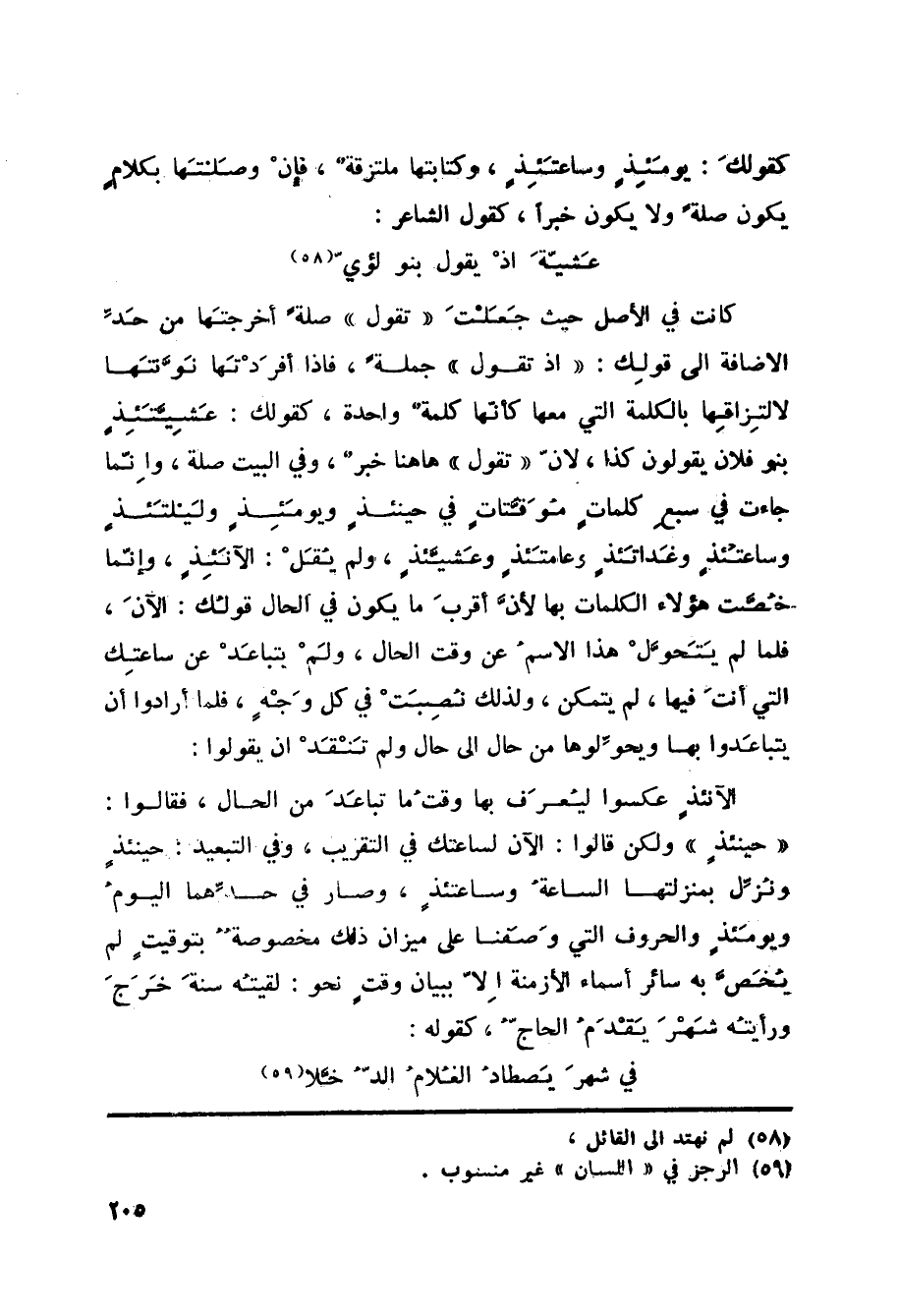 كانت في الأصل حيث جَعَلْتَ تقول صلةً أخرجتَها من حد الإضافة إلى قولِك: إذ تقول جملةً، فإذا أفردتها نونتها لالتزاقها بالكلمة التي معها كأنّها كلمة واحدة، كقولك: عَشِيَّتَئِذٍ بنو فلان يقولون كذا، لأنّ تقول هاهنا خبر، وفي البيت صلة، وإنما جاءت في سبع كلمات موقتات في حينئذٍ ويومَئِذٍ ولَيلَتئذٍ وساعتَئذٍ وغَداتَئذٍ وعامتَئذٍ وعشيئذ، ولم يُقَلْ: الآنَئِذٍ، وإنّما خُصَّت هؤلاء الكلمات بها لأنَّ أقربَ ما يكون في الحال قولُك: الآنَ، فلما لم يَتَحوَّلْ هذا الاسمُ عن وقت الحال، ولم يتباعد عن ساعتِك التي أنتَ فيها، لم يتمكن، ولذلك نُصِبَتْ في كل وَجْهٍ، فلما أرادوا أن يتباعَدوا بها ويحوِّلوها من حال إلى حال ولم تَنْقَدْ أن يقولوا: الآنئذٍ عكَسوا ليُعرَف بها وقتُ ما تباعَدَ من الحال، فقالوا: حينئذٍ ولكن قالوا: الآن لساعتك في التقريب، وفي التبعيد: حينئذٍ ونُزِّل بمنزلتها الساعةُ وساعتئذٍ، وصار في حدِّهما اليومُ ويومَئذٍ والحروف التي وَصَفنا على ميزان ذلك مخصوصةٌ بتوقيتٍ لم يُخَصَّ به سائر أسماء الأزمنة إلاِّ ببيان وقتٍ نحو: لقيتُه سنةَ خَرَجَ ورأيتُه شَهْرَ يُقْدَمُ الحاجُّ، كقوله:
