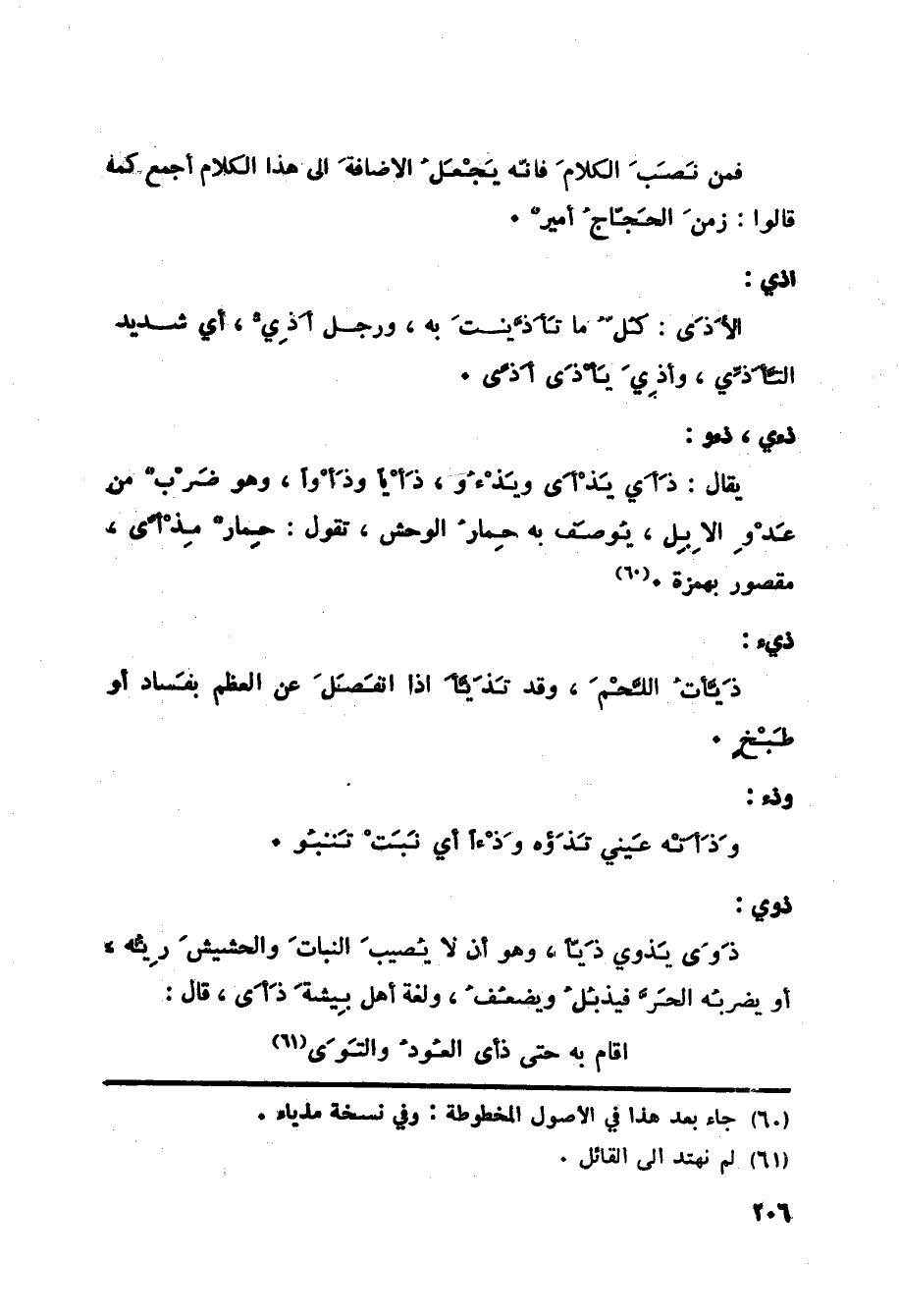 ذأي، ذءو: يقال: ذَأَي يَذْأَى ويَذْءُو، ذَأْياً وذَأْواً، وهو ضَرْبٌ من عَدْوِ الإِبِل، يُوصَف به حِمارُ الوحش، تقول: حِمارٌ مِذْأىً، مقصور بهمزة «60» .