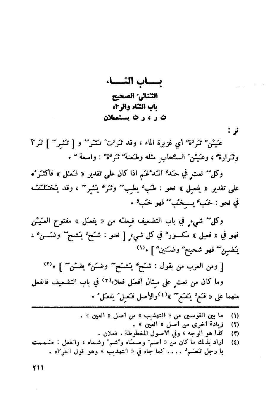(4) أراد بذلك ما كان من أصم وصماء وأشم وشماء، والفعل: صممت يا رجل تصم.... كما جاء في التهذيب وهو قول الفراء.