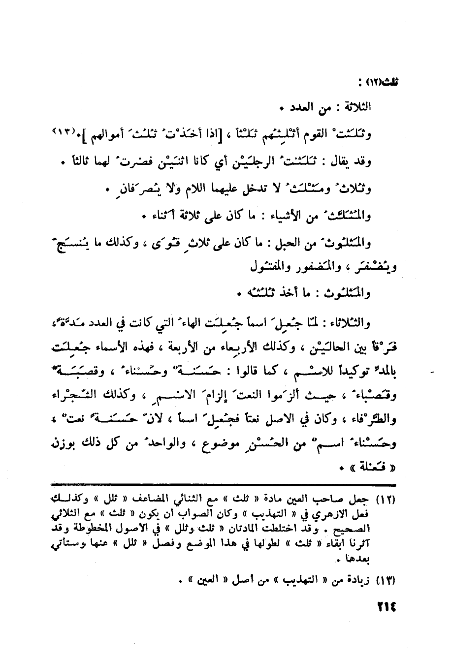 (12) جعل صاحب العين مادة ثلث مع الثنائي المضاعف ثلل وكذلك فعل الأزهري في التهذيب وكان الصواب أن يكون ثلث مع الثلاثي الصحيح. وقد اختلطت المادتان ثلث وثلل في الأصول المخطوطة وقد آثرنا إبقاء ثلث لطولها في هذا الموضع وفصل ثلل عنها وستأتي بعدها.