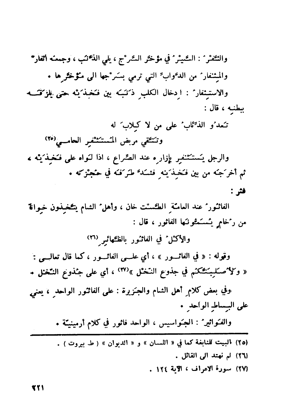 وقوله: في الفاثور، أي على الفاثور، كما قال تعالى: وَلَأُصَلِّبَنَّكُمْ فِي جُذُوعِ النَّخْلِ «28» ، أي على جُذوع النّخل. وفي بعض كلامِ أهل الشام والجَزيرة: على الفاثُور الواحدِ، يعني على البِساطِ الواحدِ. والفَواثيرُ: الجَواسيس، الواحد فاثور في كلام أرمينية.