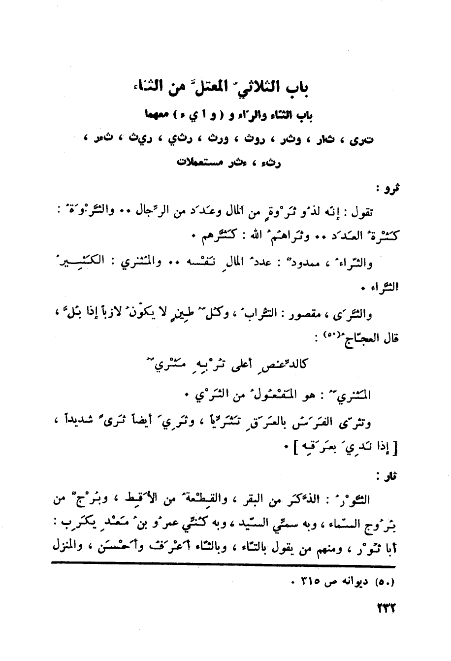ثرو: تقول: إنّه لذُو ثَرْوةٍ من المال وعَدَد من الرِّجال.. والثَّرْوَةُ: كَثْرةُ العَدَد.. وثَراهُمُ الله: كَثَّرهم. والثّراءُ، ممدودٌ: عددُ المالِ نَفْسه.. والمُثري: الكَثِيرُ الثَّراء. والثَّرى، مقصور: التُّرابُ، وكُلُّ طِينٍ لا يكونُ لازباً إذا بُلَّ، قال العجّاجُ «51» :