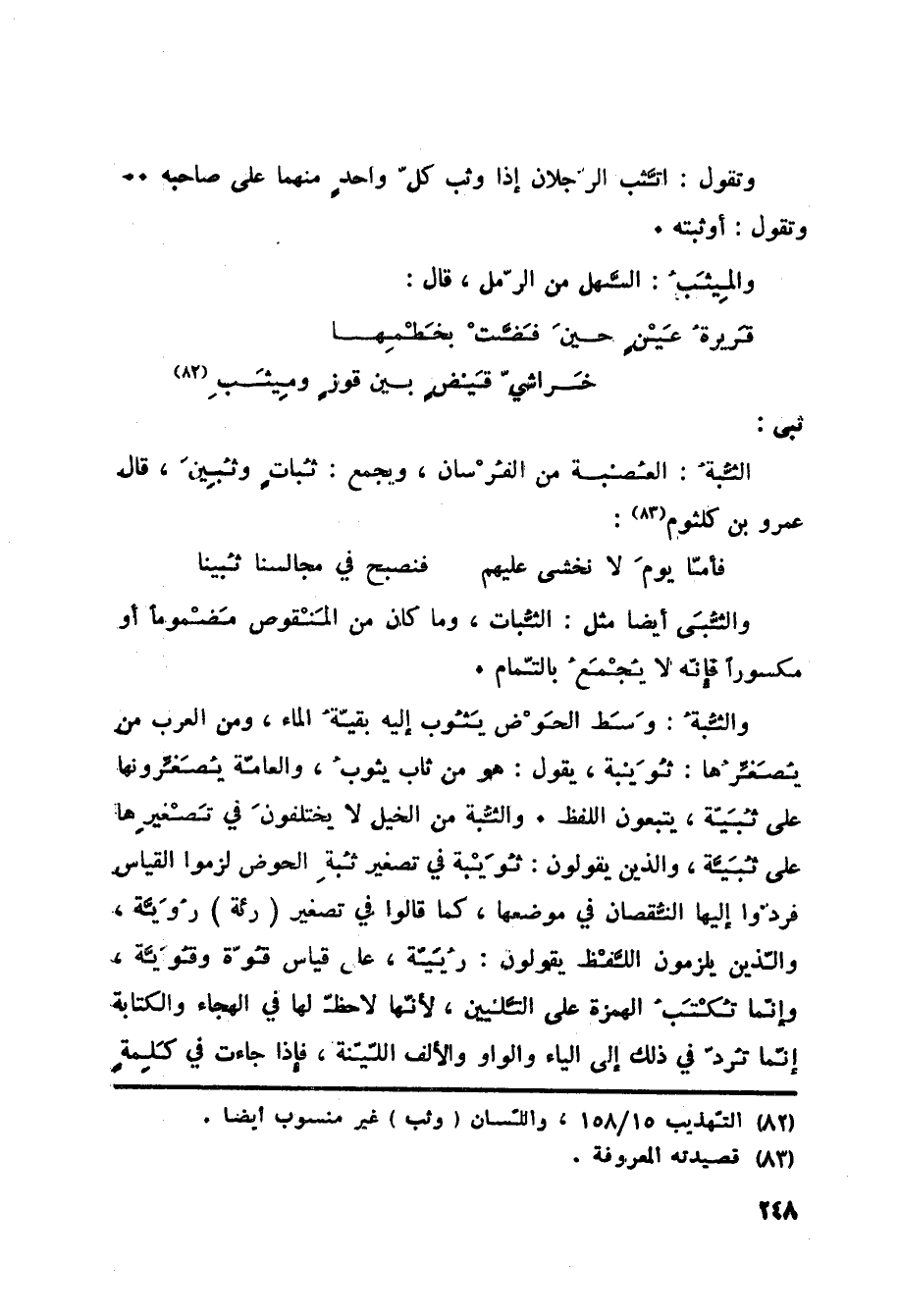 وتقول: اتَّثب الرّجلان إذا وثب كلّ واحدٍ منهما على صاحبه.. وتقول: أوثبته. والمِيثَبُ: السَّهل من الرّمل، قال: