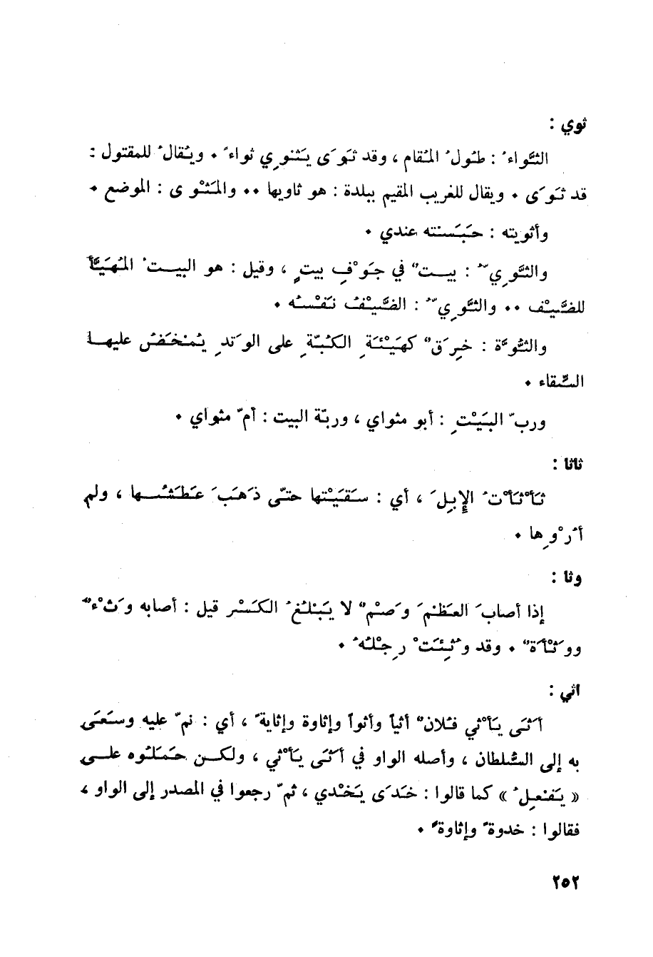 ثوي: الثَّواءُ: طُولُ المُقام، وقد ثَوَى يَثْوِي ثواءً. ويُقالُ للمقتول: قد ثَوَى. ويقال للغريب المقيم ببلدة: هو ثاويها. والمَثْوى: الموضع. وأثويته: حَبَسْته عندي. والثَّوِيُّ: بيتٌ في جَوْفِ بيتٍ، وقيل: هو البيتُ المُهَيَّأ للضَّيْف. والثَّوِيُّ: الضَّيْفُ نَفْسُه. والثُّوَّة: خِرَقٌ كهَيْئَةِ الكُبّةِ على الوَتدِ يُمْخَضُ عليها السِّقاء. وربّ البَيْتِ: أبو مثواي، وربّة البيت: أمّ مثواي.