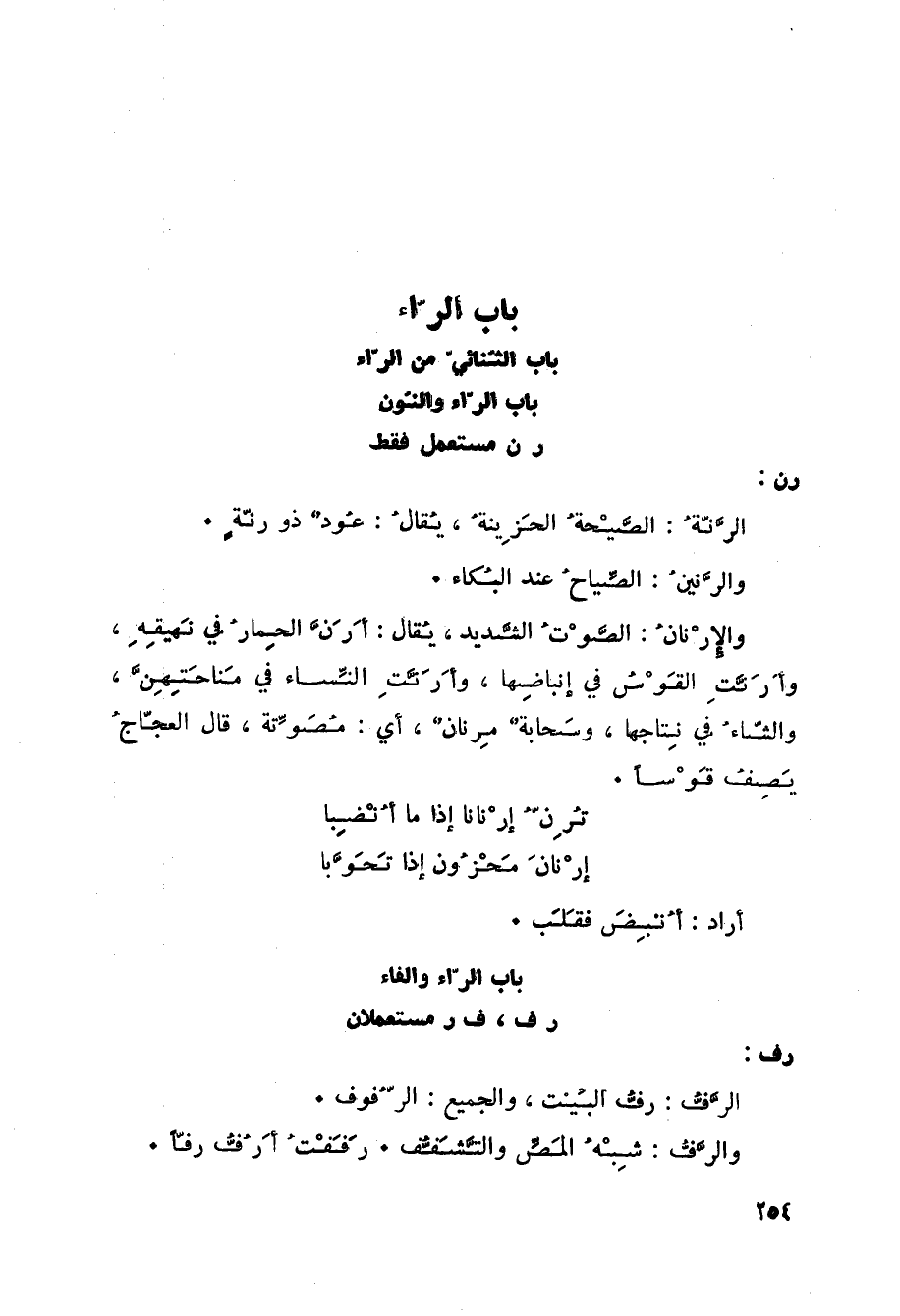 رن: الرَّنّةُ: الصَّيْحةُ الحَزِينةُ، يُقالُ: عُودٌ ذو رنّةٍ. والرَّنينُ: الصِّياحُ عند البُكاء. والإِرْنانُ: الصَّوْتُ الشَّديد، يُقال: أَرَنَّ الحِمارُ في نَهيقِهِ، وأَرَنَّتِ القَوْسُ في أنباضِها، وأَرَنَّتِ النِّساء في مناحتهن، والشاء في نِتاجها، وسَحابةٌ مِرنانٌ، أي: مُصَوِّتة، قال العجّاجُ يَصِفُ قَوْساً: