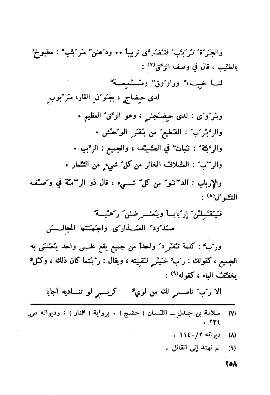ويُرْوَى: لدى حِضَجْرٍ، وهو الزِّقُ العظيم. والرَّبْرَبُ: القطيع من بقر الوحش. والرَّبَّةُ: نَباتٌ في الصَّيْف، والجميع: الرِّبب. والرُّبّ: السُّلافُ الخاثر من كلّ شيءٍ من الثِّمار. والإرباب: الدُّنُوّ من كل شيء، قال ذو الرُّمّة في وَصْف الشَّوْل «8» :