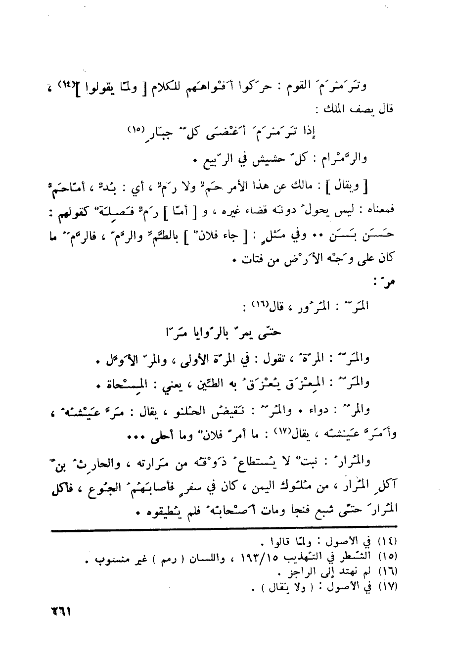والمَرُّ: المرّةُ، تقول: في المرّة الأولى، والمرّ الأَوَّل. والمَرُّ: المِعْزَق يُعْزَقُ به الطِّين، يعني: المِسْحاة. والمرُّ: دواء. والمُرُّ: نَقيضُ الحُلْو، يقال: مَرَّ عَيْشُهُ، وأَمَرَّ عَيْشُه، يقال «17» : ما أمرّ فلانٌ وما أحلى ... والمُرارُ: نبتٌ لا يُستطاعُ ذَوْقُه من مَرارته، والحارِثُ بنُ آكلِ المُرار، من مُلُوك اليمن، كان في سفرٍ فأصابَهُمُ الجُوع، فأكل المُرارَ حتّى شبع فنجا ومات أَصْحابُهُ فلم يطيقوه.
