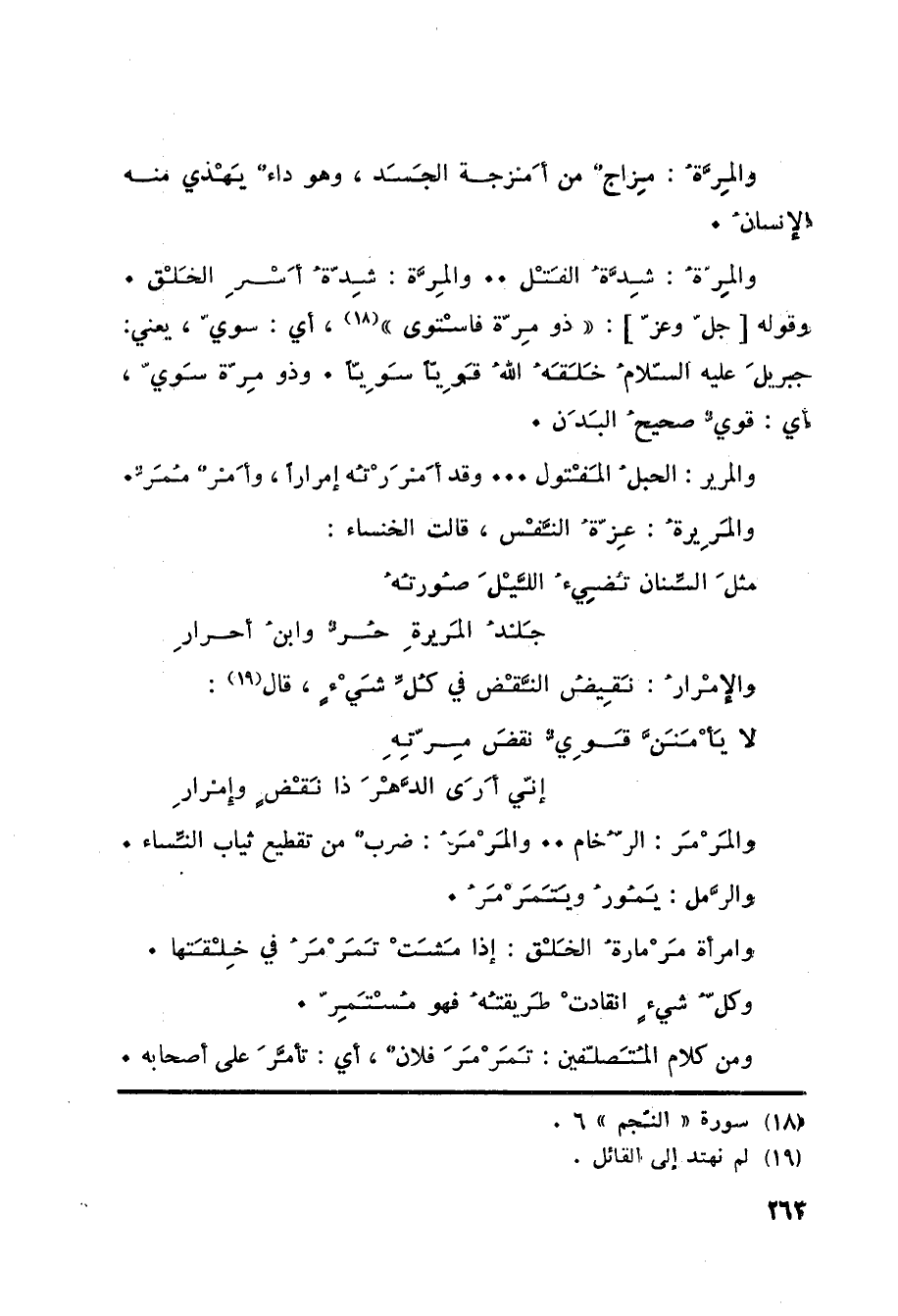 «18» ، أي: سويّ، يعني: جبريلَ عليه السّلامُ خَلَقَهُ اللَّهُ قَوِيّاً سَوِيّاً. وذو مِرّة سَويّ، أي: قويٌّ صحيحُ البَدَن. والمرير: الحبلُ المَفْتول ... وقد أَمْرَرْتُه إمراراً، وأَمْرٌ مُمَرٌّ. والمَرِيرةُ: عِزّةُ الَّنْفس، قالت الخنساء: