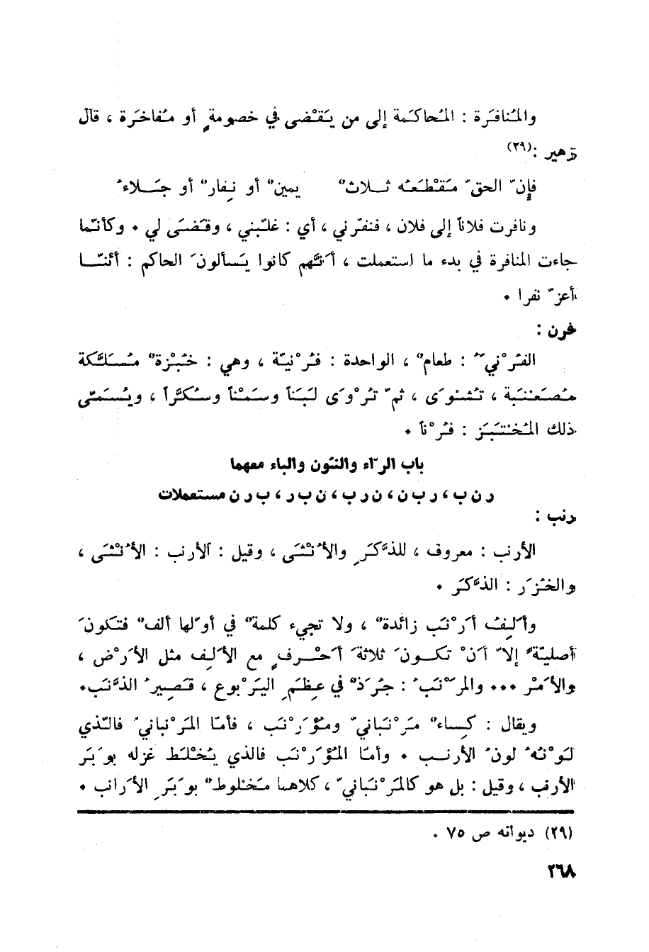 رنب: الأرنب: معروف، للذَّكَرِ والأُنْثَى، وقيل: الأرنب: الأُنْثَى، والخُزَر: الذَّكَر. وأَلِفُ أَرْنَب زائدةٌ، ولا تجيء كلمةٌ في أوّلها ألفٌ فتكونَ أصليّةً إلاّ أَنْ تكونَ ثلاثةَ أَحْرفٍ مع الأَلِف مثل الأَرْض، والأَمْر ... والمَرْنَبُ: جُرَذٌ في عِظَمِ اليَرْبوع، قَصِيرُ الذَّنَب. ويقال: كِساءٌ مَرْنَبانيّ ومُؤَرْنَب، فأمّا المَرْنبانيّ فالذّي لَوْنُهُ لونُ الأرنب. وأمّا المُؤَرْنَب فالذي يُخْلَط غزله بوَبَر الأرنب، وقيل: بل هو كالمَرْنَبانيّ، كلاهما مَخلوطٌ بوَبَرِ الأرانب.
