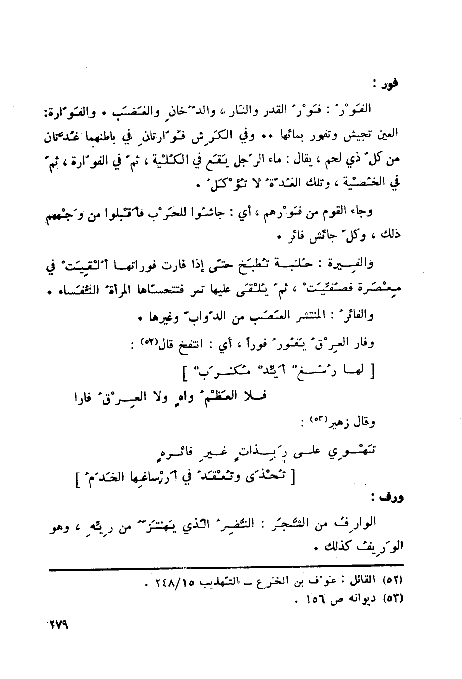 فور: الفَوْرُ: فَوْرُ القدر والنّار، والدُّخانِ والغَضَب. والفَوّارة: العين تجيش وتفور بمائها. وفي الكَرِش فَوّارتانِ في باطنهما غُدَّتان من كلّ ذي لحم، يقال: ماء الرّجل يَقَع في الكُلْية، ثمّ في الفوّارة، ثمّ في الخُصْية، وتلك الغُدّةُ لا تُؤْكَلُ. وجاء القوم من فَوْرهم، أي: جاشُوا للحَرْب فأَقْبلوا من وَجْههم ذلك، وكلّ جائش فائر. والفِيرة: حُلبة تُطبَخ حتّى إذا فارت فوراتها أُلْقِيَتْ في مِعْصَرة فصُفِّيَتْ، ثم يُلْقَى عليها تمر فتتحسّاها المرأة النُّفَساء. والفائرُ: المنتشر العَصَب من الدّوابّ وغيرها. وفار العِرْقُ يَفُورُ فوراً، أي: انتفخ قال «52» :