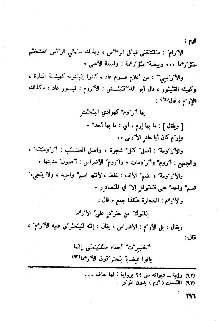 أرم: الأَرامُ: مُلْتَقَى قبائل الرَّأْس، وبذلك سَمِّي الرّأس الضَّخْم مُؤَرَّماً ... وبيضةٌ مُؤَرَّمة: واسعة الأعلى. والأَرَمِيُّ: من أعلام قوم عاد، كانوا يَبْنونه كهيئة المنارة، وكهيئة القُبُور، قال أبو الدُّقَيْش: الأُروم: قبور عاد، وكذلك الإرَم، قال «92» :