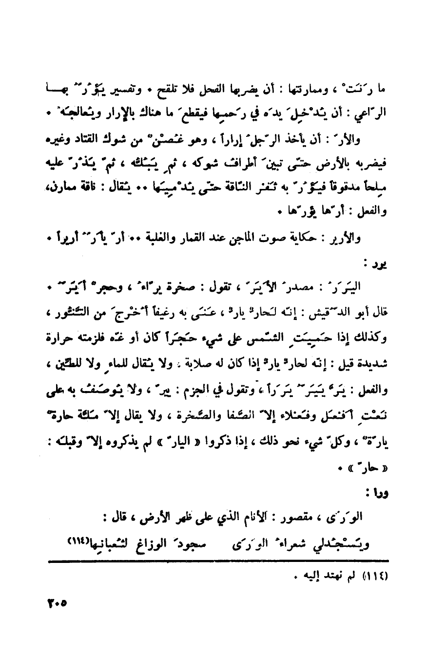 مارنت، وممارنتها: أن يضربها الفحل فلا تلقح. وتفسير يَؤُرُّ بها الرّاعي: أن يُدْخِلَ يدّه في رَحمِها فيقطعَ ما هناك بالإرار ويُعالجَهُ. والأرّ: أن يأخذ الرّجلُ إراراً، وهو غُصْنٌ من شوك القتاد وغيره فيضربه بالأرض حتّى تبينَ أطرافُ شوكه، ثمِ يَبُلُّه، ثمّ يَذُرّ عليه مِلحاً مدقوقاً فيَؤُرّ به ثَفْر النّاقة حتّى يُدْمِيَها ... يُقال: ناقة ممارن، والفعل: أرّها يؤرّها. والأرير: حكاية صوت الماجن عند القمار والغلبة. أرّ يأَرُّ أريراً.