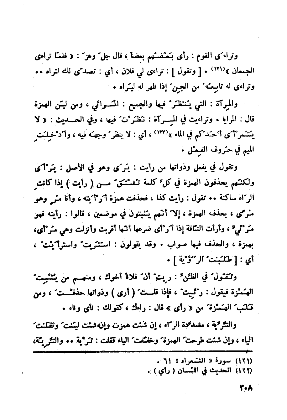 أي: لا ينظرُ وجهَه فيه، وأُدْخِلَتِ الميم في حُروف الفِعْل. وتقول في يفعل وذواتها من رأيت: يَرَى وهو في الأصل: يَرْأَى ولكنّهم يحذفون الهمزة في كلِّ كلمة تُشْتَقّ من (رأيت) إذا كانتِ الرّاء ساكنة. تقول: رأيت كذا، فحذفت همزة أَرْأَيته، وأنا مُرٍ وهو مُرًى، بحذف الهمزة، إلاّ أنّهم يُثبتون في موضعين، قالوا: رأيته فهو مَرْئيٌّ، وأرأت النّاقة إذا أَرْأى ضرعها أنّها أقربت وأنزلت وهي مُرْأى، بهمزة، والحذف فيها صواب. وقد يقولون: اسْتَريتُ واسترأَيْتُ، أي: [طَلَبْتُ الرُّؤْية] . وتَقُولُ في الظَّنِّ: رِيتُ أنّ فلاناً أخوك، ومنهم من يُثْبِتُ الهَمْزة فيقول: رُئِيتُ، فإِذا قلتَ (أرى) وذواتها حذفْتَ، ومن قَلَبَ الهَمْزةَ من رأى قال: راءك، كقولك: نأى وناء. والتَّرِّية، مشدَّدة الرّاء، إن شئت همزت وإن شئت ليّنتَ وثقّلْتَ الياء، وإن شئت طرحتَ الهمزةَ وخفّفتَ الياء فقلت: تَرْية. والترية،