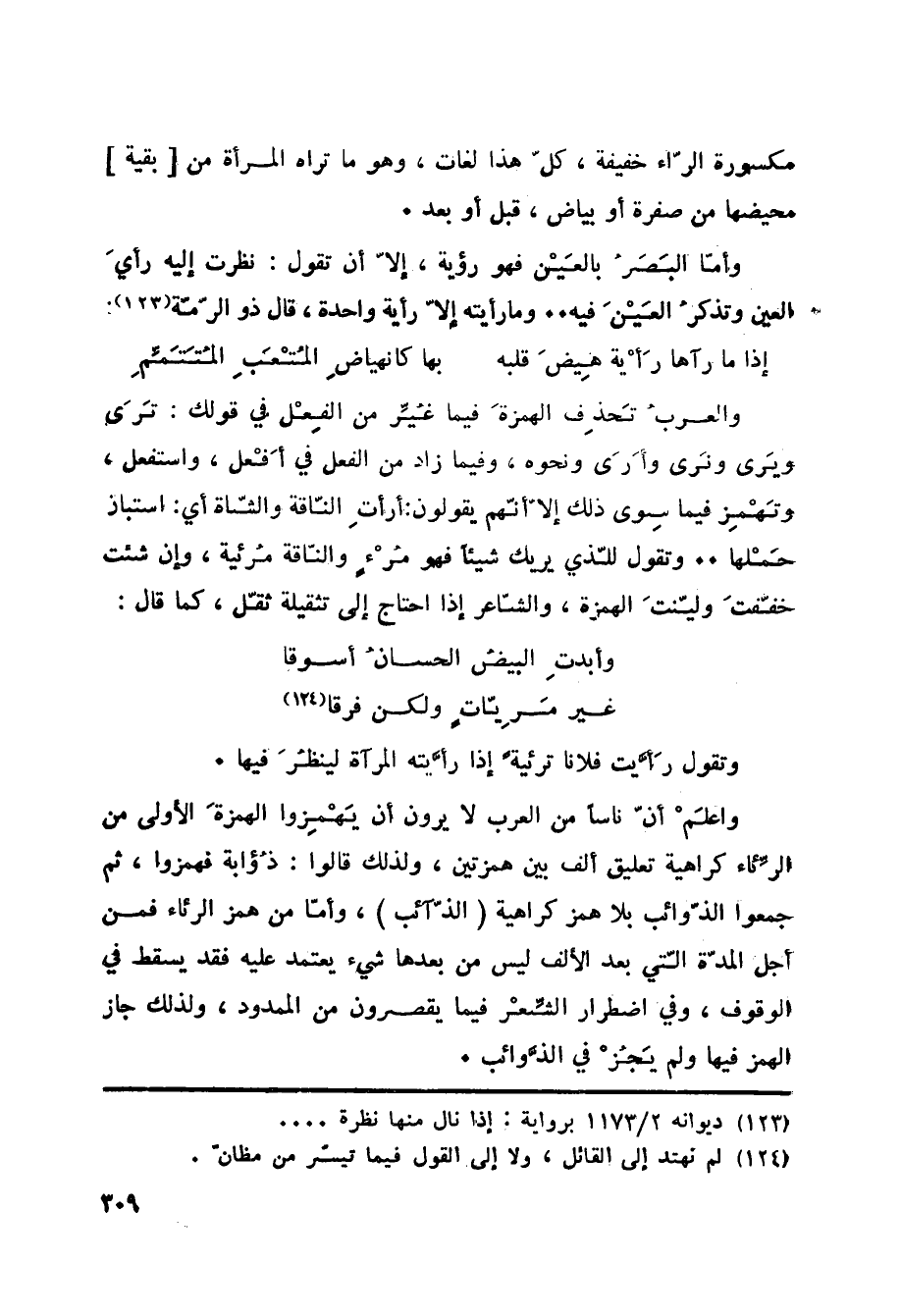 والعربُ تَحذِف الهمزةَ فيما غُيِّر من الفِعْل في قولك: تَرَى ويَرى ونَرى وأَرَى ونحوه، وفيما زاد من الفعل في أَفْعل، واستفعل، وتَهْمِز فيما سِوى ذلك إلاّ أنّهم يقولون: أرأتِ النّاقة والشّاة أي: استبان حَمْلها. وتقول للّذي يريك شيئاً فهو مُرْءٍ والنّاقة مُرئية، وإن شئت خفّفتَ وليّنتَ الهمزة، والشّاعر إذا احتاج إلى تثقيلة ثقّل، كما قال: