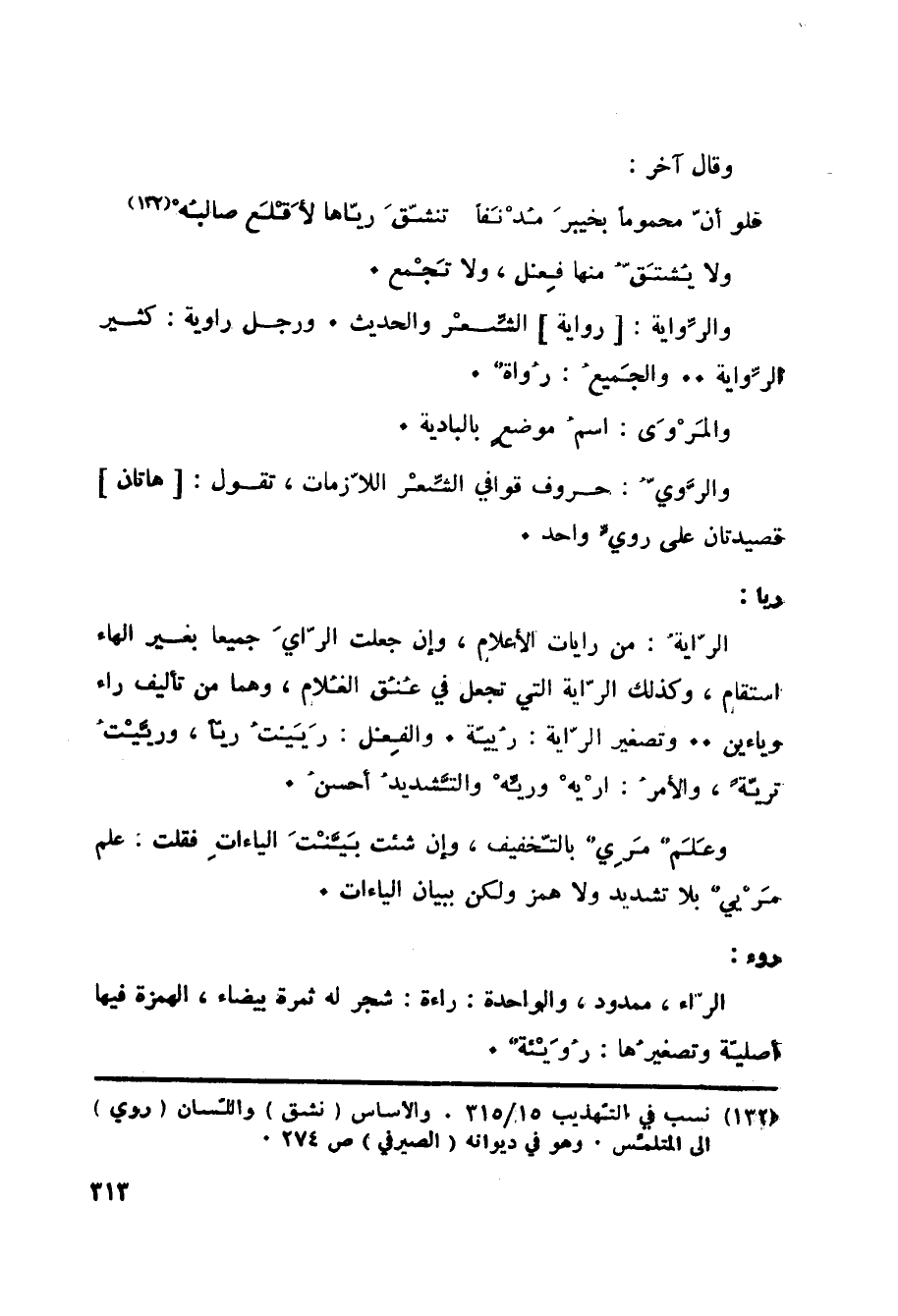 ولا يُشتَقُّ منها فِعْل، ولا تَجْمع. والرِّواية: [رواية] الشِّعْر والحديث. ورجل راوية: كثير الرِّواية. والجَميعُ: رُواةٌ. والمَرْوَى: اسمُ موضعٍ بالبادية. والرَّويُّ: حروف قوافي الشِّعْر اللاّزمات، تقول: [هاتان] قصيدتان على رويٍّ واحد.