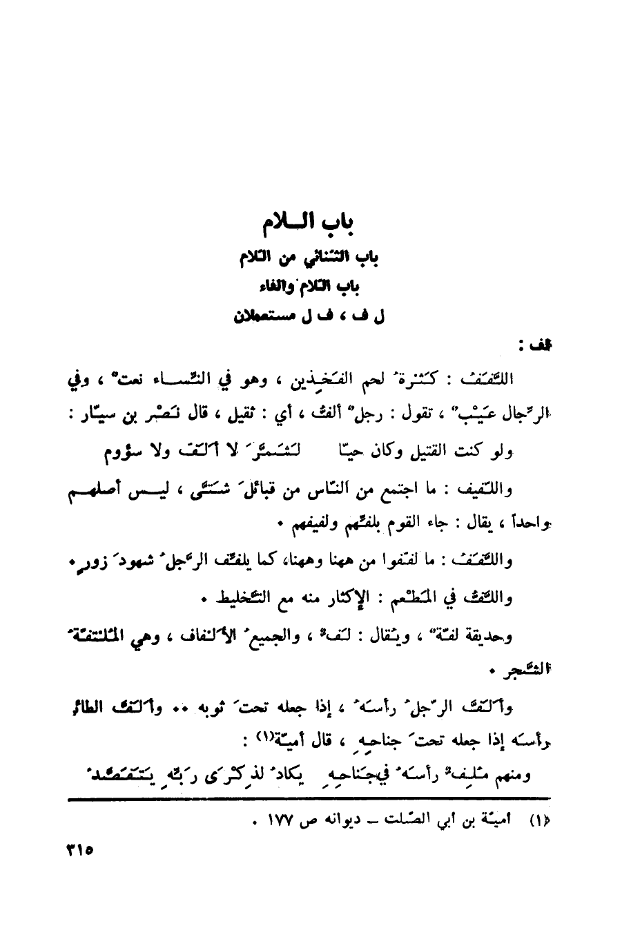 واللّفيف: ما اجتمع من النّاس من قبائلَ شَتَّى، ليس أصلهم واحداً، يقال: جاء القوم بلفِّهم ولفيفهم. واللَّفَفُ: ما لفّفوا من هاهنا وهاهنا، كما يلفِّف الرَّجلُ شهودَ زور. واللفف في المَطْعم: الإكثار منه مع التَّخليط. وحديقة لفّةٌ، ويُقال: لَفٌّ، والجميعُ الأَلْفاف، وهي المُلْتفّةُ الشَّجر. وأَلّفَّ الرّجلُ رأسَهُ، إذا جعله تحتَ ثوبه. وأَلّفَّ الطائر رأسه إذا جعله تحت جناحِهِ، قال أميّة «1» :