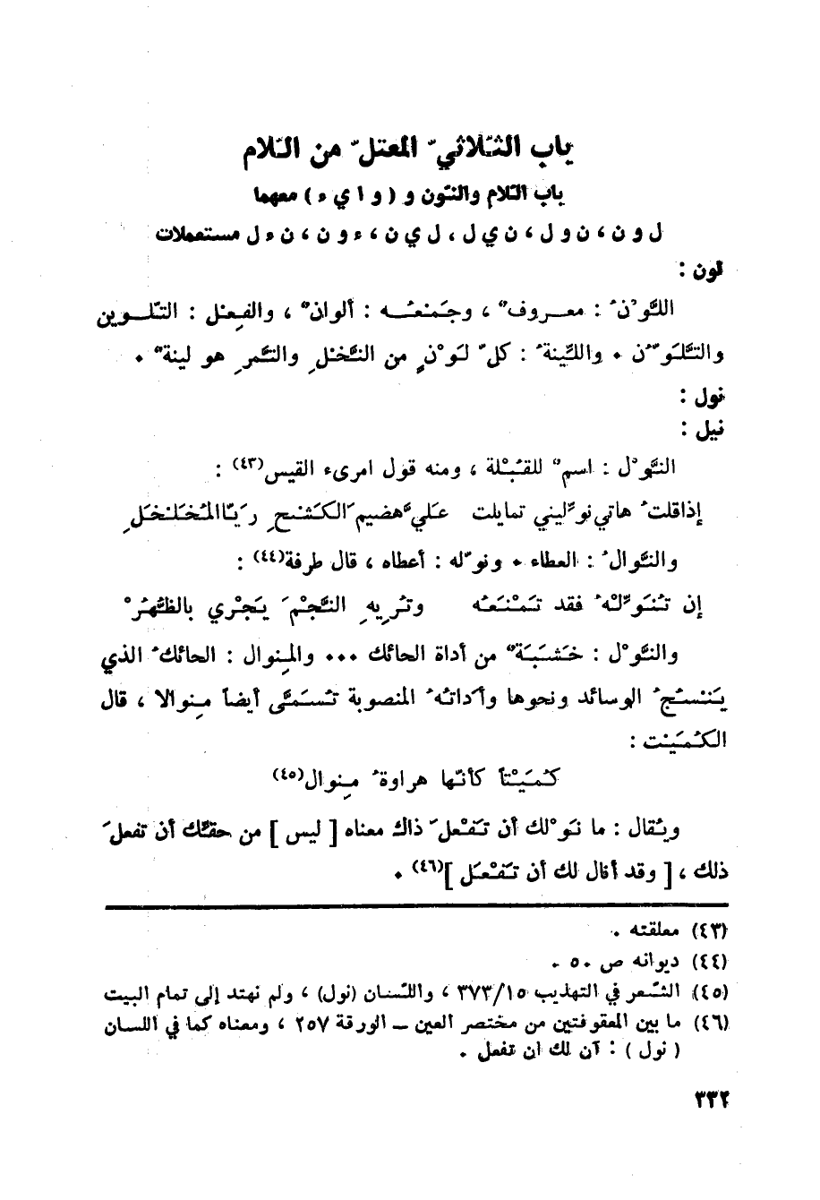 باب اللام والنون و (وا يء) معهما ل ون، ن ول، ن ي ل، ل ي ن، ء ون، نء ل مستعملات