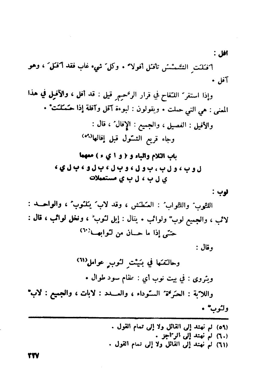 أفل: أَفَلَتِ الشَّمْسُ تأفُل أفولاً. وكلّ شيء غاب فقد أَفَلَ، وهو آفل. وإذا استقرّ اللّقاح في قرار الرَّحِمِ قيل: قد أفل، والآفِل في هذا المعنى: هي التي حَمَلَتْ. ويقولون: لبوءة آفل وآفلة إذا حَمَلَتْ. والأفيل: الفصيل، والجميع: الإِفالُ، قال: