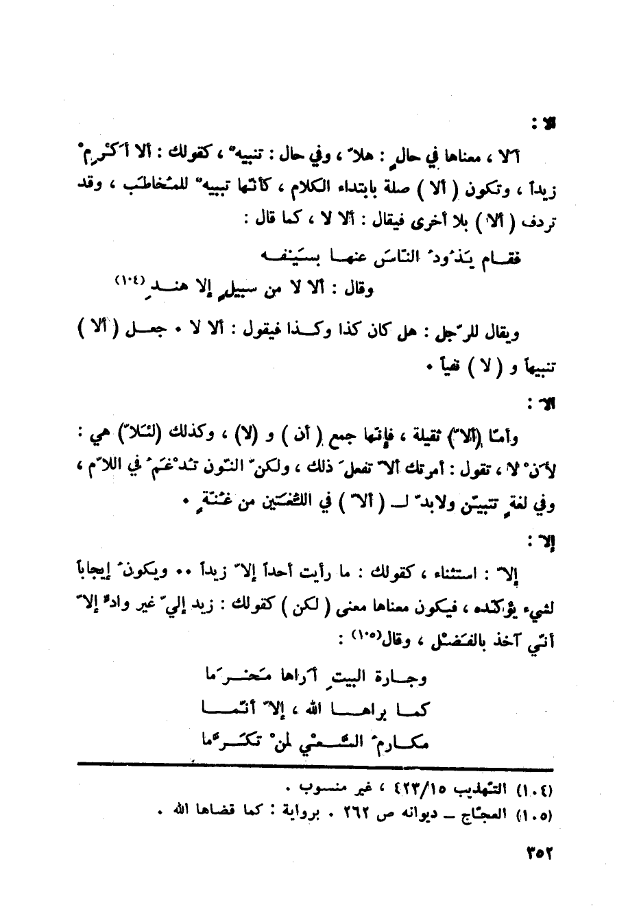 إلاّ: إلاّ: استثناء، كقولك: ما رأيت أحداً إلاّ زيداً. ويكونُ إيجاباً لشيء يؤكّده، فيكون معناها معنى (لكن) كقولك: زيد إليّ غير وادٍّ إلاّ أنّي آخذ بالفَضْل، وقال «105» :