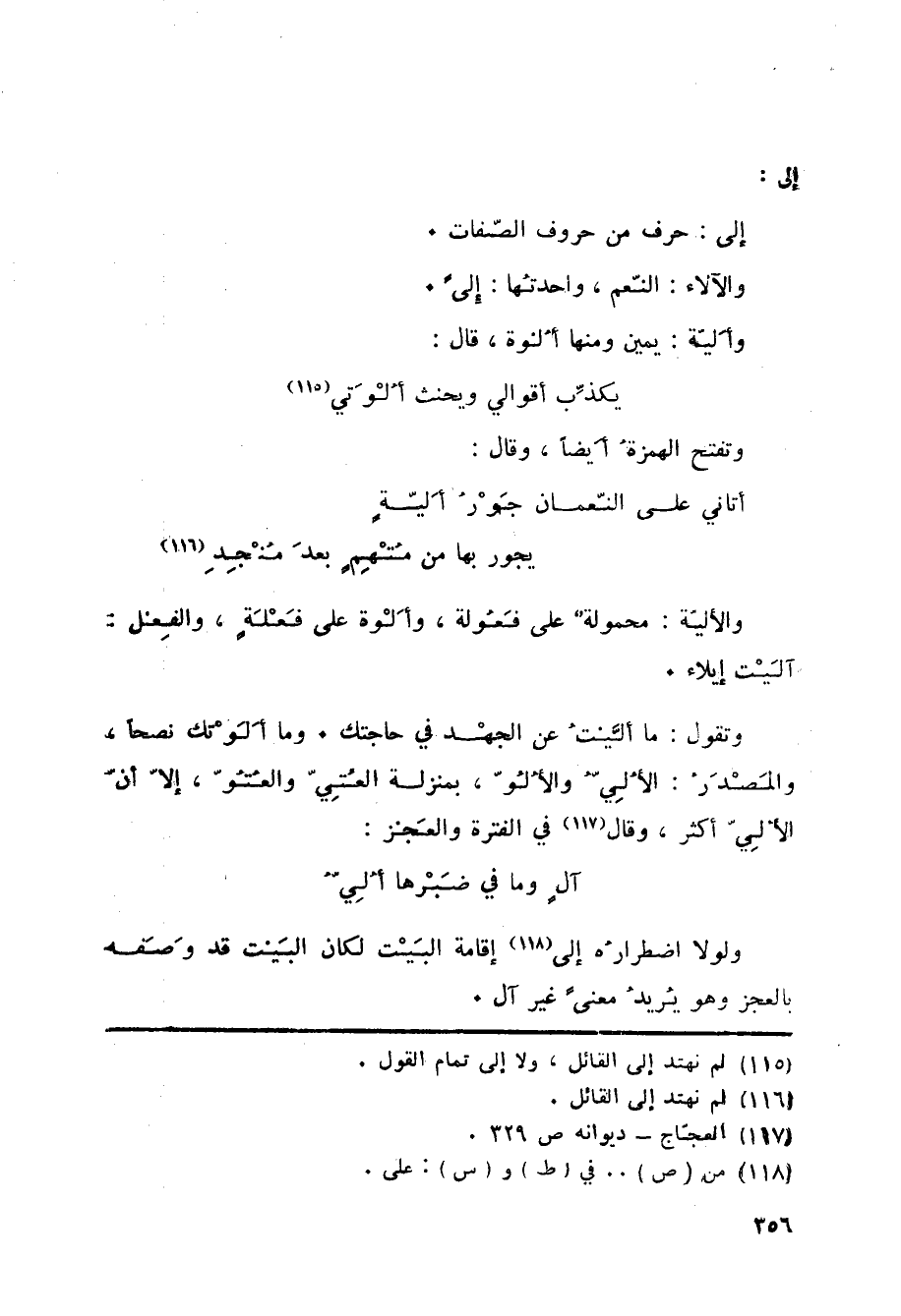 إلى: إلى: حرف من حروف الصّفات. والآلاء: النّعم، واحدتُها: إِلىً. وأَليّة: يمين ومنها أُلْوة، قال: