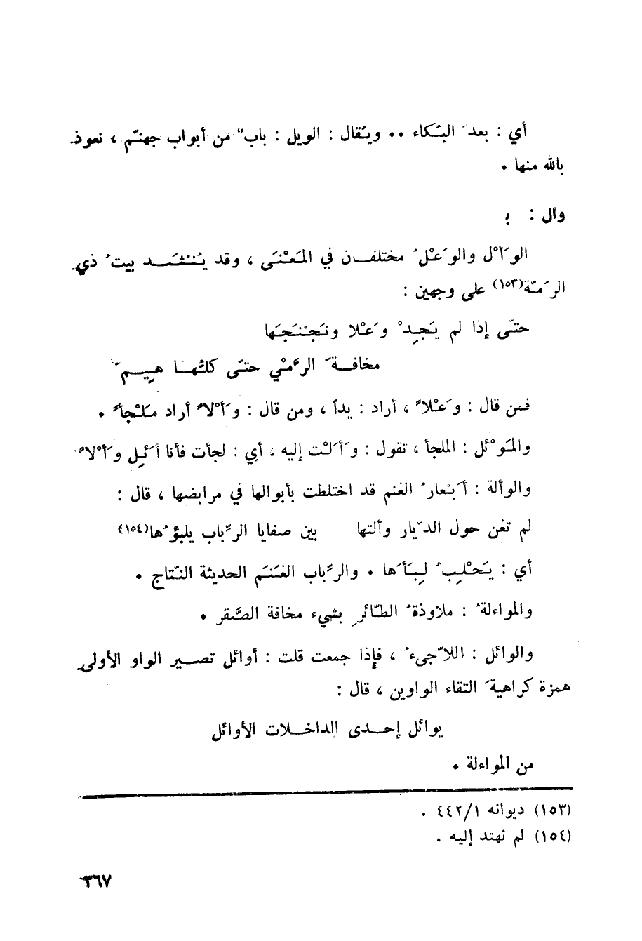 وأل: الوَأْل والوَعْلُ مختلفان في المَعْنَى، وقد يُنشَد بيتُ ذي الرّمّة «153» على وجهين: