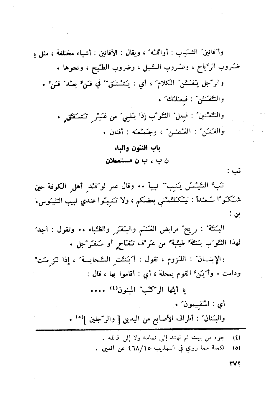 بن: البَنَّةُ: رِيحُ مرابض الغَنَم والبَقَرِ والظِّباء.. وتقول: أجدُ لهذا الثَّوْب بَنَّةً طيِّبةً من عَرْف تُفّاحٍ أو سَفَرْجل. والإبنانُ: اللّزوم، تقول: أَبَنَّتِ السَّحابةُ، إذا لَزِمَتْ ودامت. وأَبَنَّ القوم بمحلة، أي: أقاموا بها، قال: