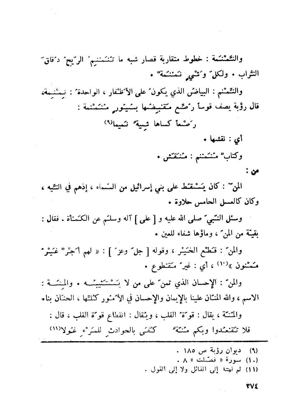 «10» ، أي: غيرُ مَقطوع. والمنّ: الإحسان الذي تمنّ على من لا يَسْتَثيبُه. والمِنّة: الاسم، والله المنّان علينا بالإيمان والإحسان في الأُمُور كُلِّها، الحنّان بنا. والمُنّة، يقال: قوّةُ القلب، ويُقال: انقطاع قوّة القلب، قال: