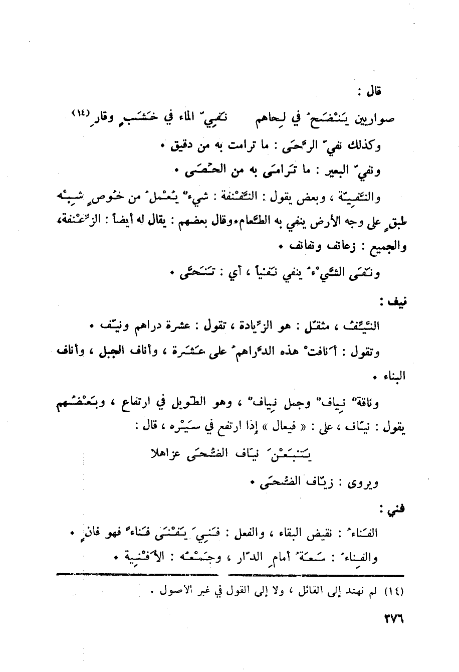 نيف: النَّيِّفُ، مثقّل: هو الزِّيادة، تقول: عشرة دراهم ونيّف. وتقول: أَنافتْ هذه الدَّراهمُ على عَشَرة، وأناف الجبل، وأناف البناء. وناقةٌ نِيافٌ وجمل نِيافٌ، وهو الطّويل في ارتفاع، وبَعْضُهم يقول: نيّاف، على: فيعال إذا ارتفع في سَيْره، قال: