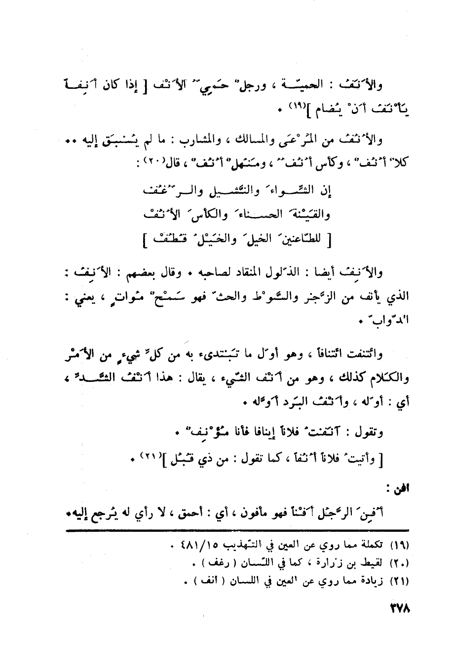 والأَنَفُ: الحميّة، ورجلٌ حَمِيُّ الأَنْف [إذا كان أَنِفاً يَأْنَفُ أَنْ يُضام] «19» . والأُنُفُ من المَرْعَى والمسالك، والمشارب: ما لم يُسبَق إليه.. كلاٌ أُنُفٌ، وكأس أُنُفٌ، ومَنُهلٌ أُنُفٌ، قال «20» :