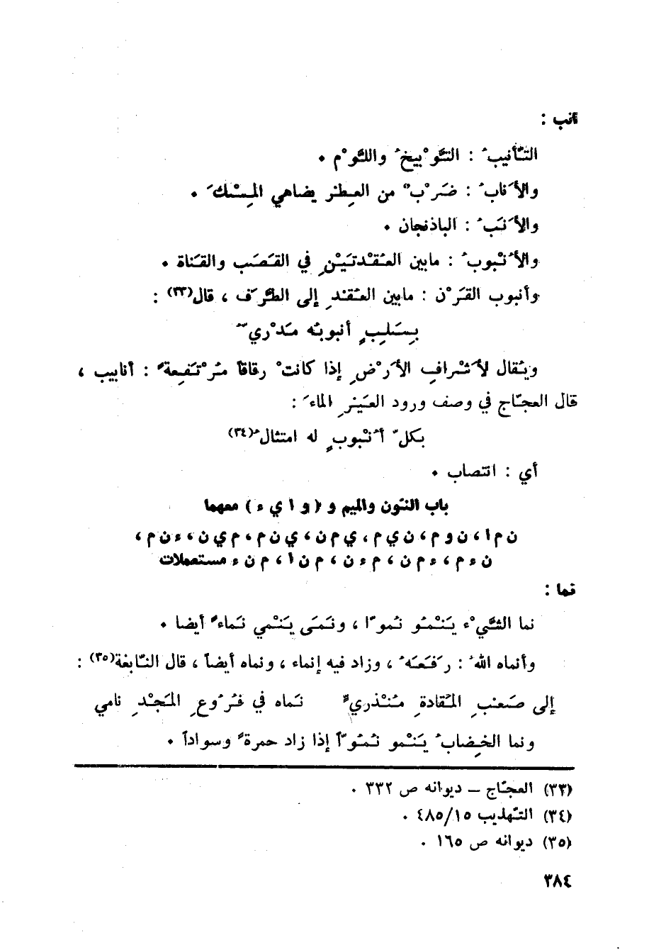 باب النون والميم و (وا يء) معهما ن م ا، ن وم، ن ي م، ي م ن، ي ن م، م ي ن، ء ن م، نء م، ء م ن، مء ن، م ن ا، م نء مستعملات
