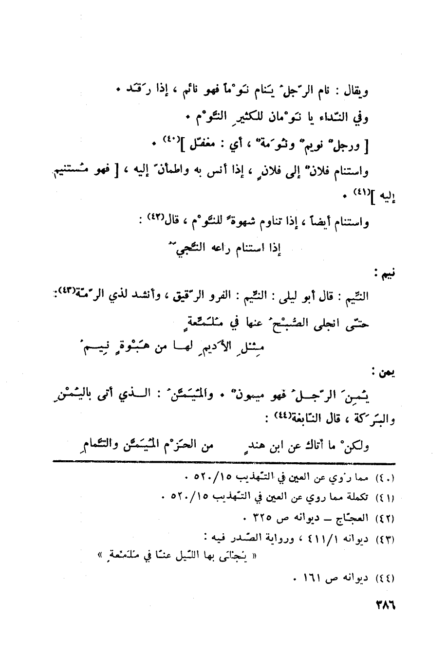 ويقال: نام الرّجلُ يَنام نَوْماً فهو نائم، إذا رَقَد. وفي النّداء يا نَوْمان للكثيرِ النَّوْم. [ورجلٌ نويمٌ ونُوَمةٌ، أي: مغفّل] «40» . واستنام فلانٌ إلى فلانٍ، إذا أنس به واطمأنّ إليه، [فهو مُستنيم إليه] «41» . واستنام أيضاً، إذا تناوم شهوةً للنَّوْم، قال: «42»