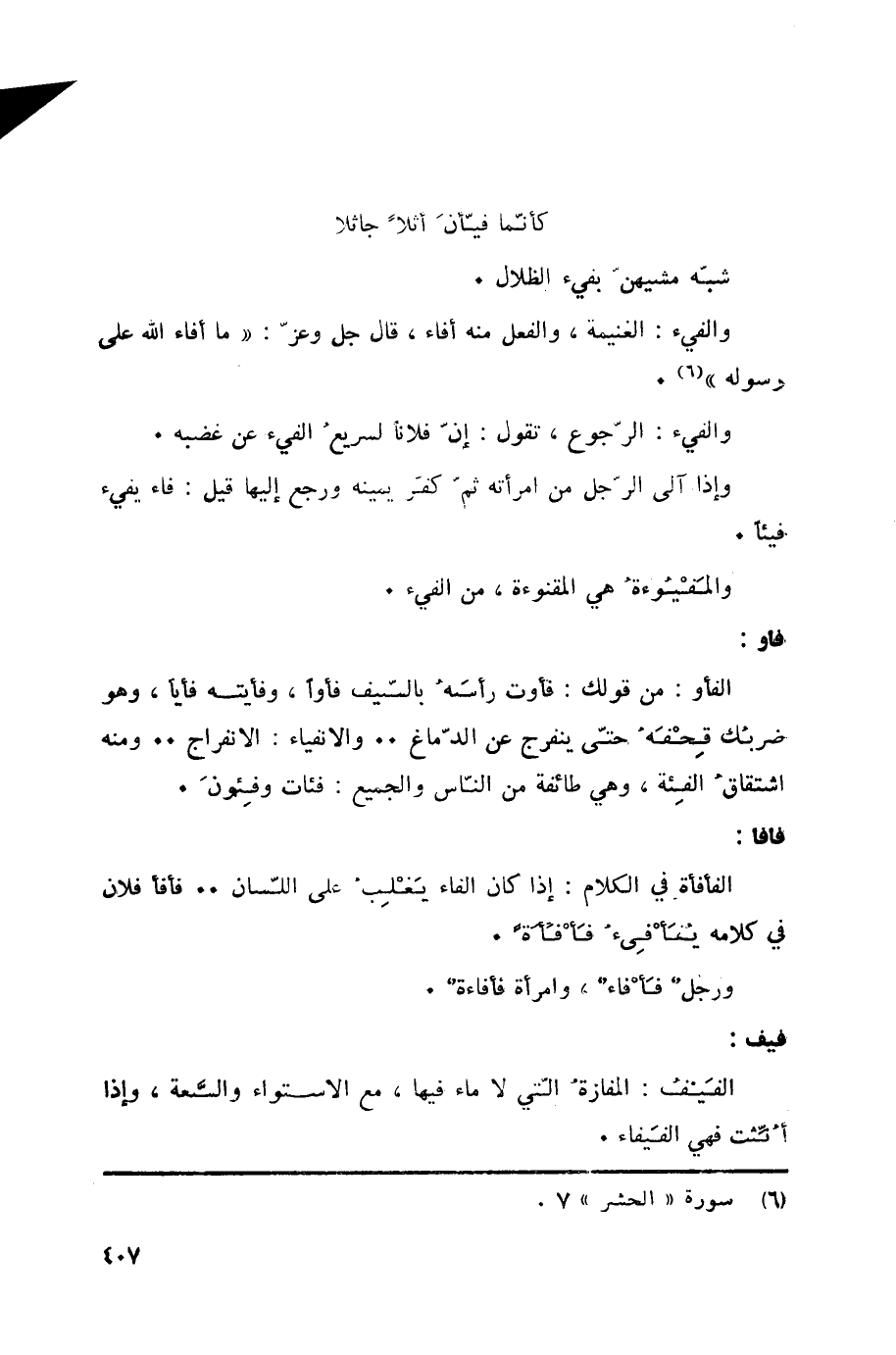 شبّه مشيهنّ بفيء الظلال. والفيء: الغنيمة، والفعل منه أفاء، قال جل وعزّ: ما أَفاءَ اللَّهُ عَلى رَسُولِهِ* «6» . والفيء: الرّجوع، تقول: إنّ فلاناً لسريعُ الفيء عن غضبه. وإذا آلى الرُّجل من امرأته ثمّ كفّر يمينه ورجع إليها قيل: فاء يفيء فيئاً. والمَفْيُوءةُ هي المقنوءة، من الفيء.