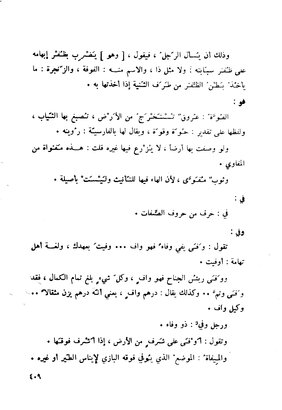 وفي: تقول: وَفَى يفي وفاءً فهو واف ... وفيتَ بعهدك، ولغة أهل تهامة: أوفيت. ووَفَى ريشُ الجناح فهو وافٍ، وكلّ شيءٍ بلغ تمام الكمال، فقد وَفَى وتمَّ.. وكذلك يقال: درهم وافٍ، يعني أنّه درهم يزن مثقالاً.. وكيل واف. ورجل وفيٌّ: ذو وفاء. وتقول: أَوْفَى على شَرفٍ من الأرض، إذا أَشْرف فوقَها. والمِيفاةُ: الموضعُ الذي يُوفي فوقه البازي لإيناس الطّير أو غيره.