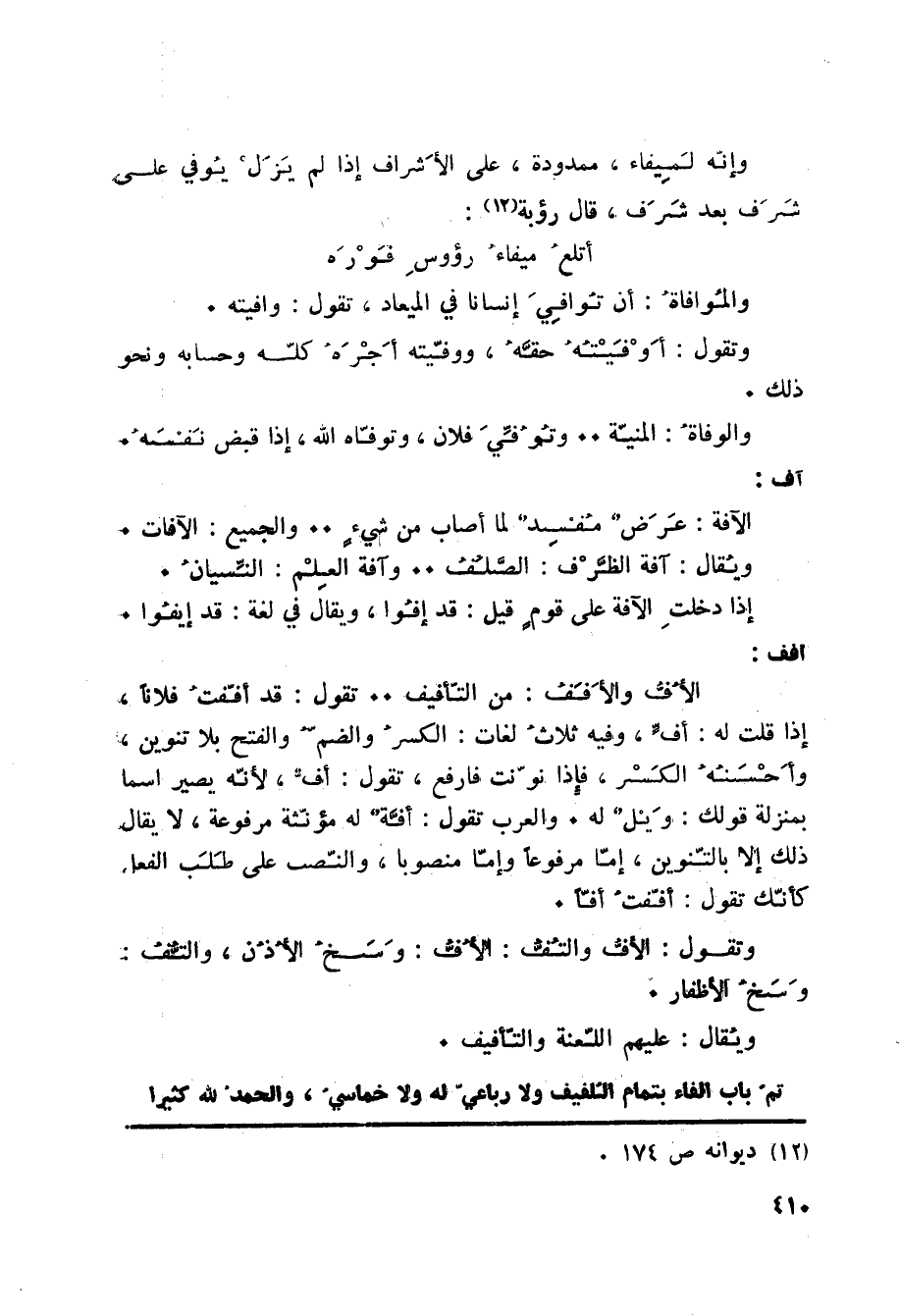 تم باب الفاء بتمام اللفيف ولا رباعي له ولا خماسي، والحمد لله كثيرا