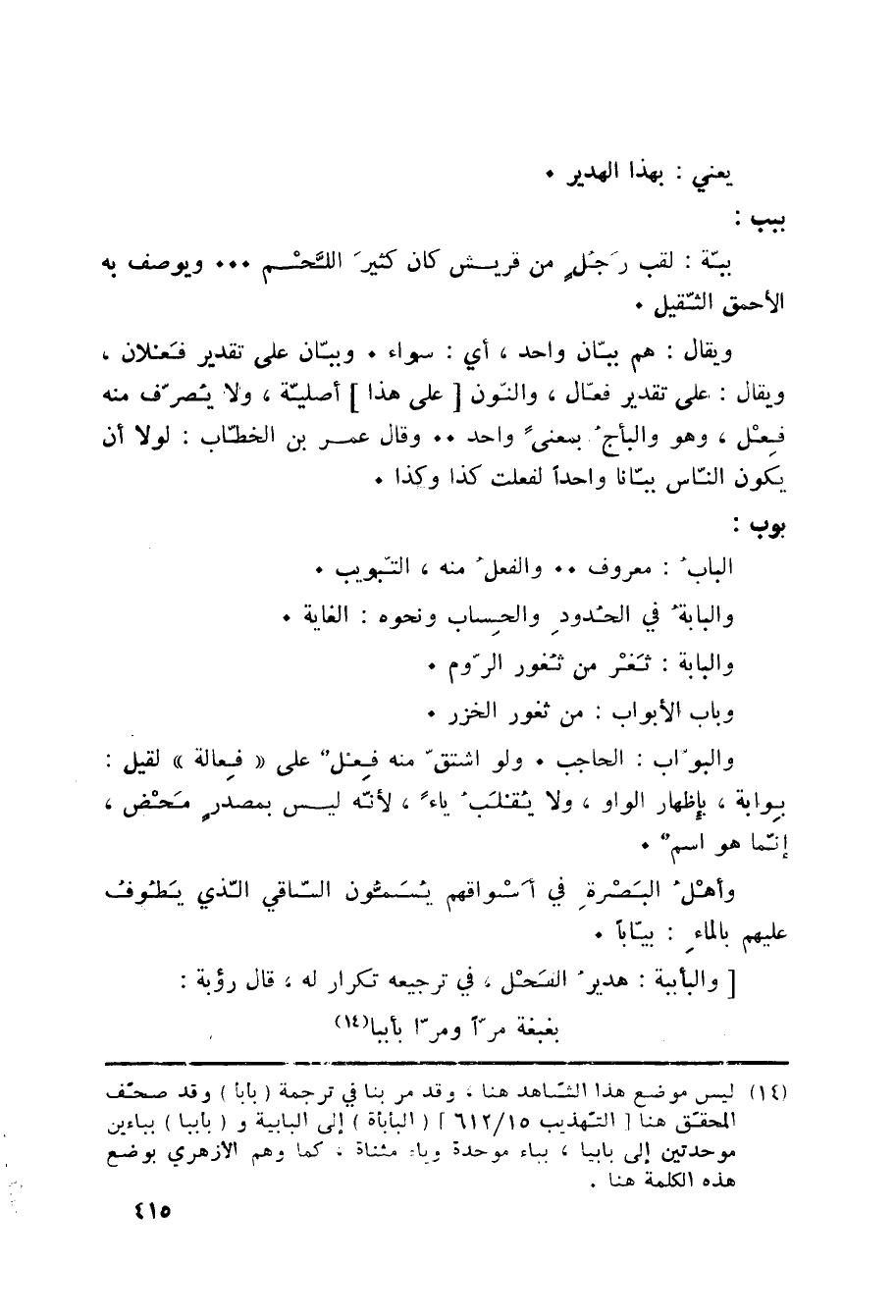 (14) ليس موضع هذا الشاهد هنا، وقد مر بنا في ترجمة (بأبأ) وقد صحف المحقق هنا [التهذيب 15/ 612] (البأبأة) إلى البابية و (بأببا) بباءين موحدتين إلى بابيا، بباء موحدة وياء مثناة، كما وهم الأزهري بوضع هذه الكلمة هنا.