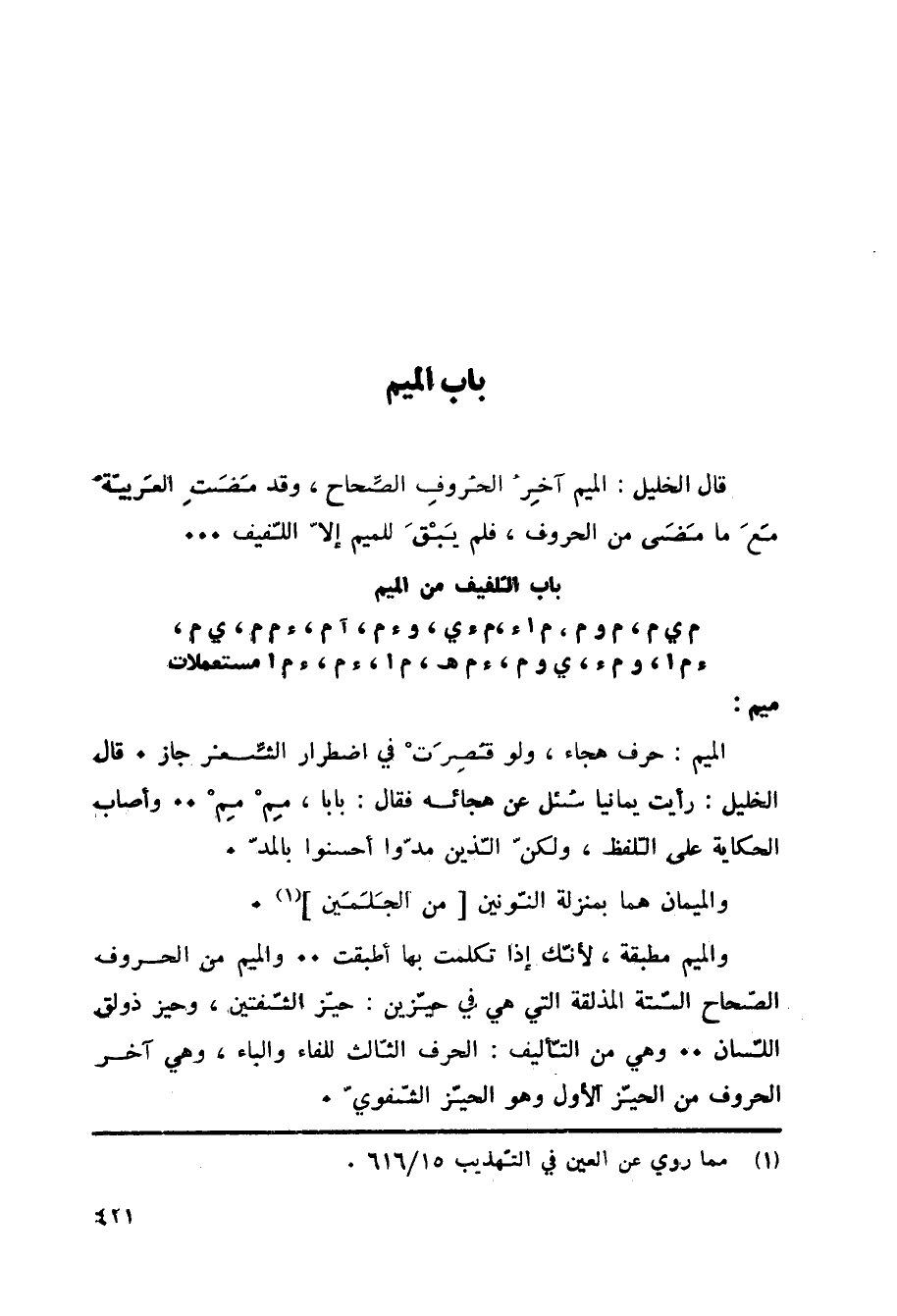 قال الخليل: الميم آخِرُ الحُروفِ الصِّحاح، وقد مَضَتِ العَربيّةُ مَعَ ما مَضَى من الحروف، فلم يَبْقَ للميم إلاّ اللّفيف ...