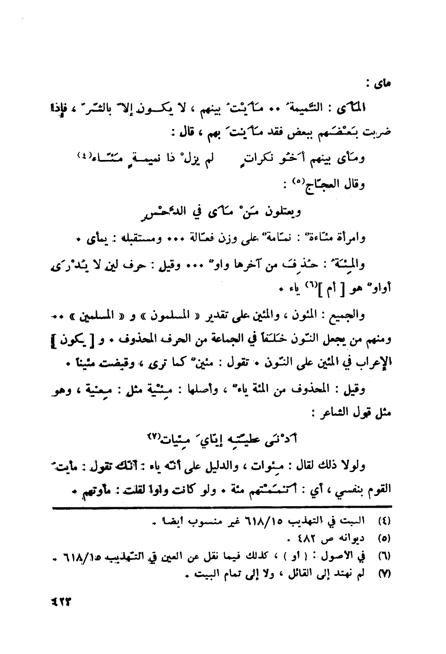 ولولا ذلك لقال: مِئوات، والدليل على أنّه ياء: أنّك تقول: مأيت القوم بنفسي، أي: أَتمَمْتهم مئة. ولو كانت واوا لقلت: مأوتهم.
