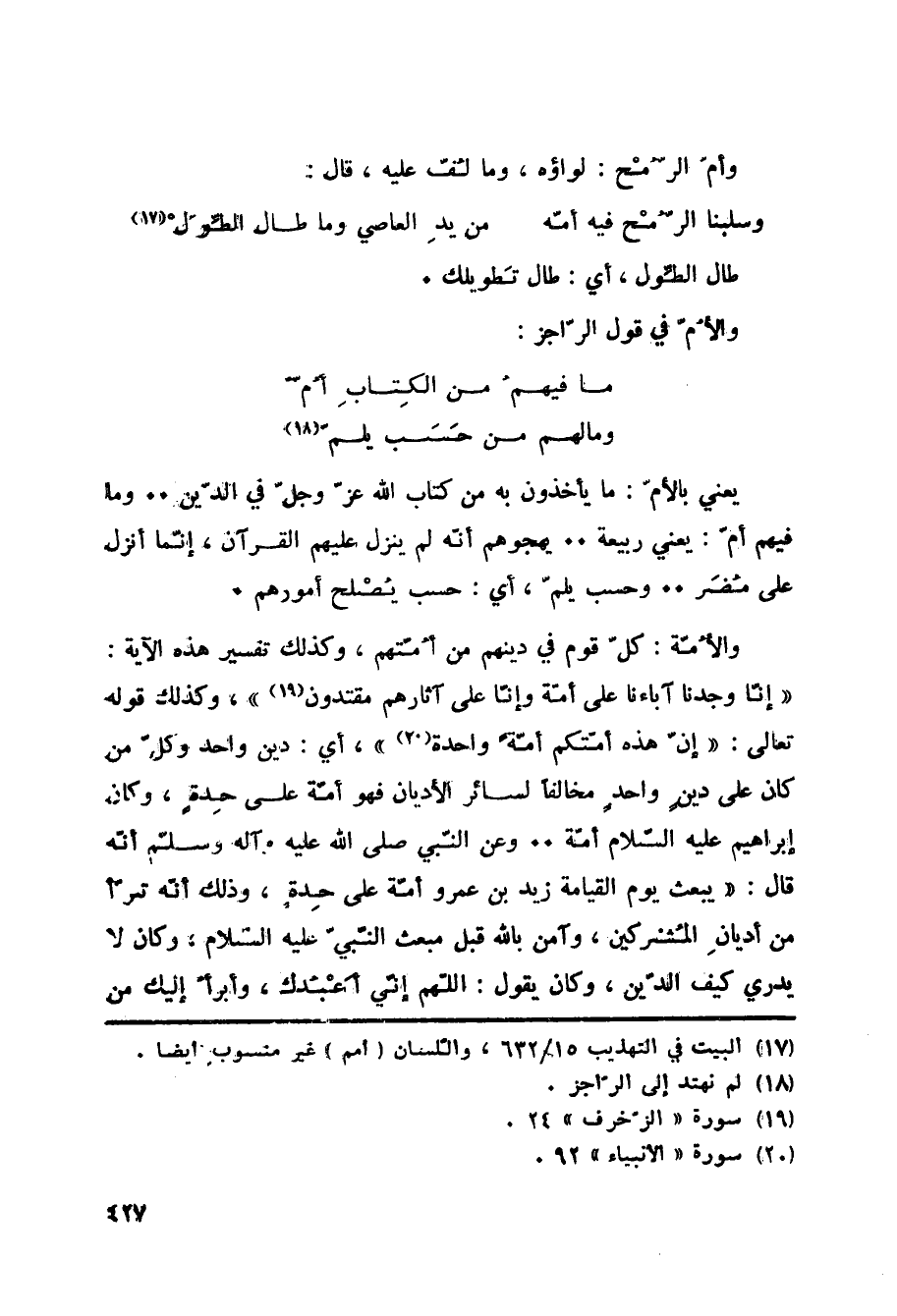 يعني بالأمّ: ما يأخذون به من كتاب الله عزّ وجلّ في الدّين.. وما فيهم أمّ: يعني ربيعة.. يهجوهم أنّه لم ينزل عليهم القرآن، إنّما أنزل على مُضَر.. وحسب يلمّ، أي: حسب يُصْلح أمورهم. والأُمّة: كلّ قوم في دينهم من أُمّتهم، وكذلك تفسير هذه الآية: إِنَّا وَجَدْنا آباءَنا عَلى أُمَّةٍ وَإِنَّا عَلى آثارِهِمْ مُقْتَدُونَ «19» ، وكذلك قوله تعالى: إِنَّ هذِهِ أُمَّتُكُمْ أُمَّةً واحِدَةً